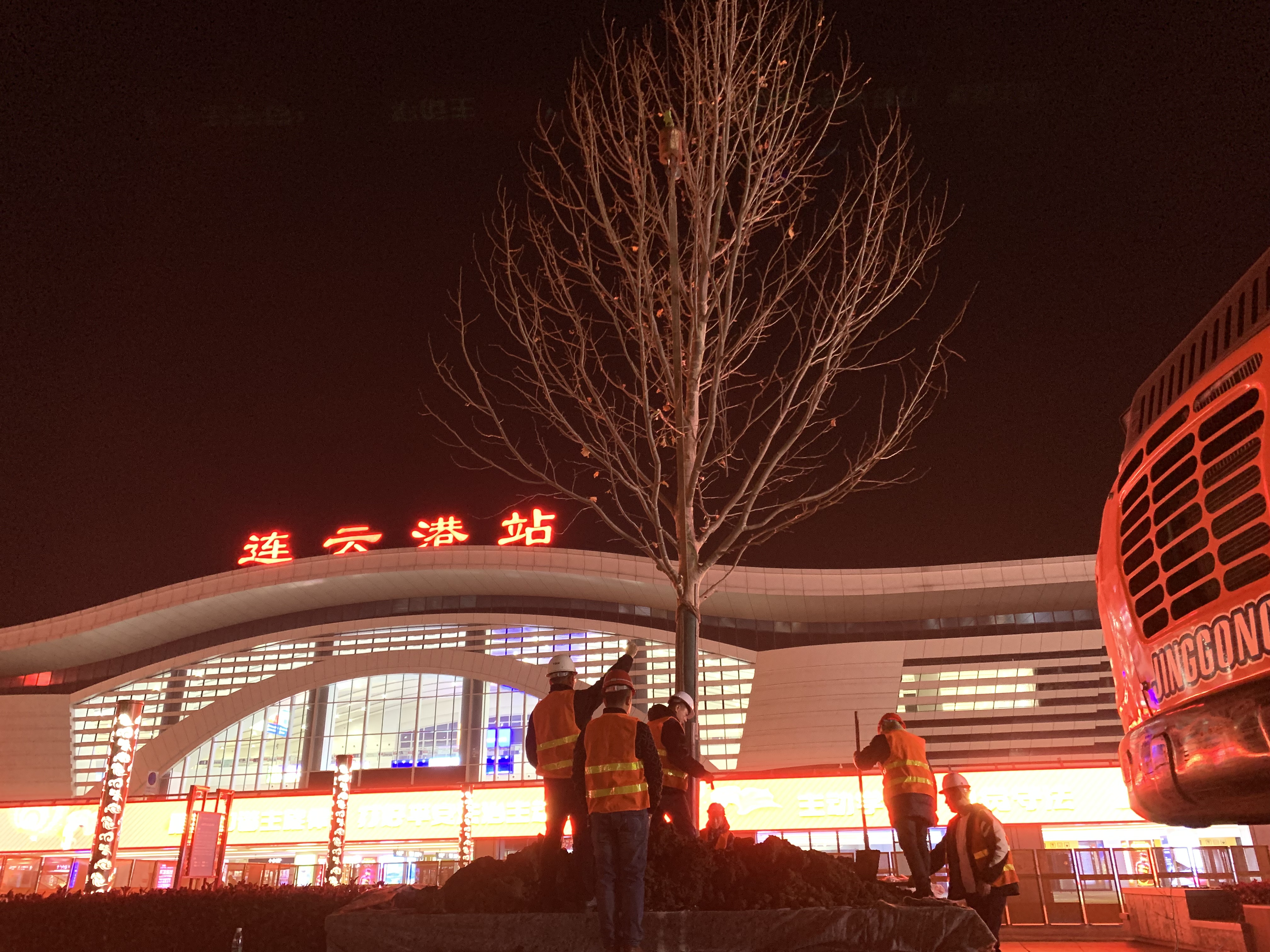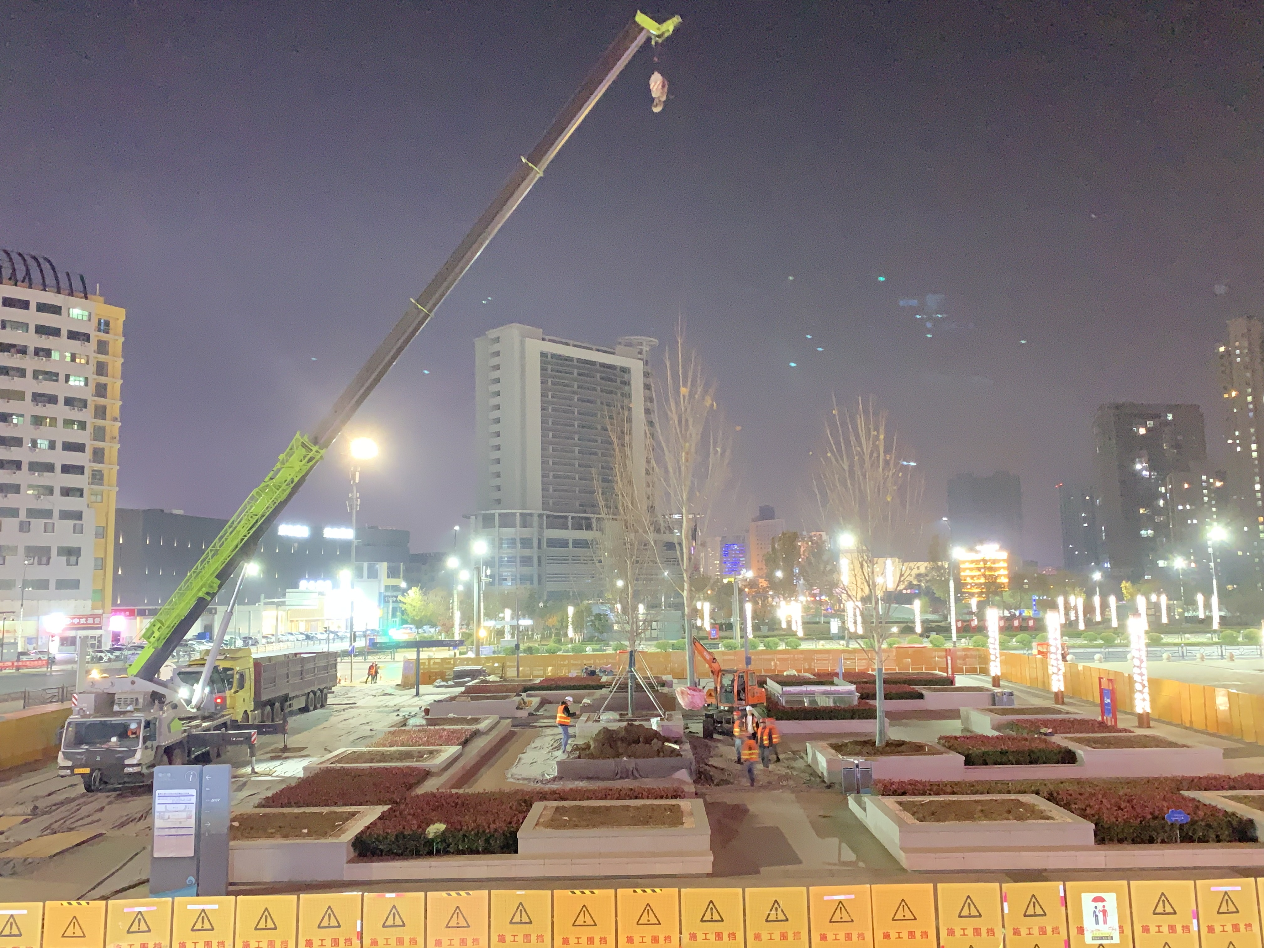 根据交通集团综合客运枢纽周边绿化提升工程施工方案和创文创卫相关要求,综合客运枢纽属于交通要道,客流量较大,工程施工要最大程度不影响旅客通行,保证施工现场安全、整洁。丰达公司积极采取措施,对整个施工现场进行封闭围挡,禁止非施工人员进入,确保工程施工安全,并及时清理现场垃圾,达到文明施工要求,同时合理安排施工计划,采取错峰作业、夜间施工的方式,白天做好已植苗木修剪断干、支架固定、保水养护等工作,利用夜间客流量较少的情况,组织大型机械和人员作业,全力推进施工进度,确保工程按时保质完工。