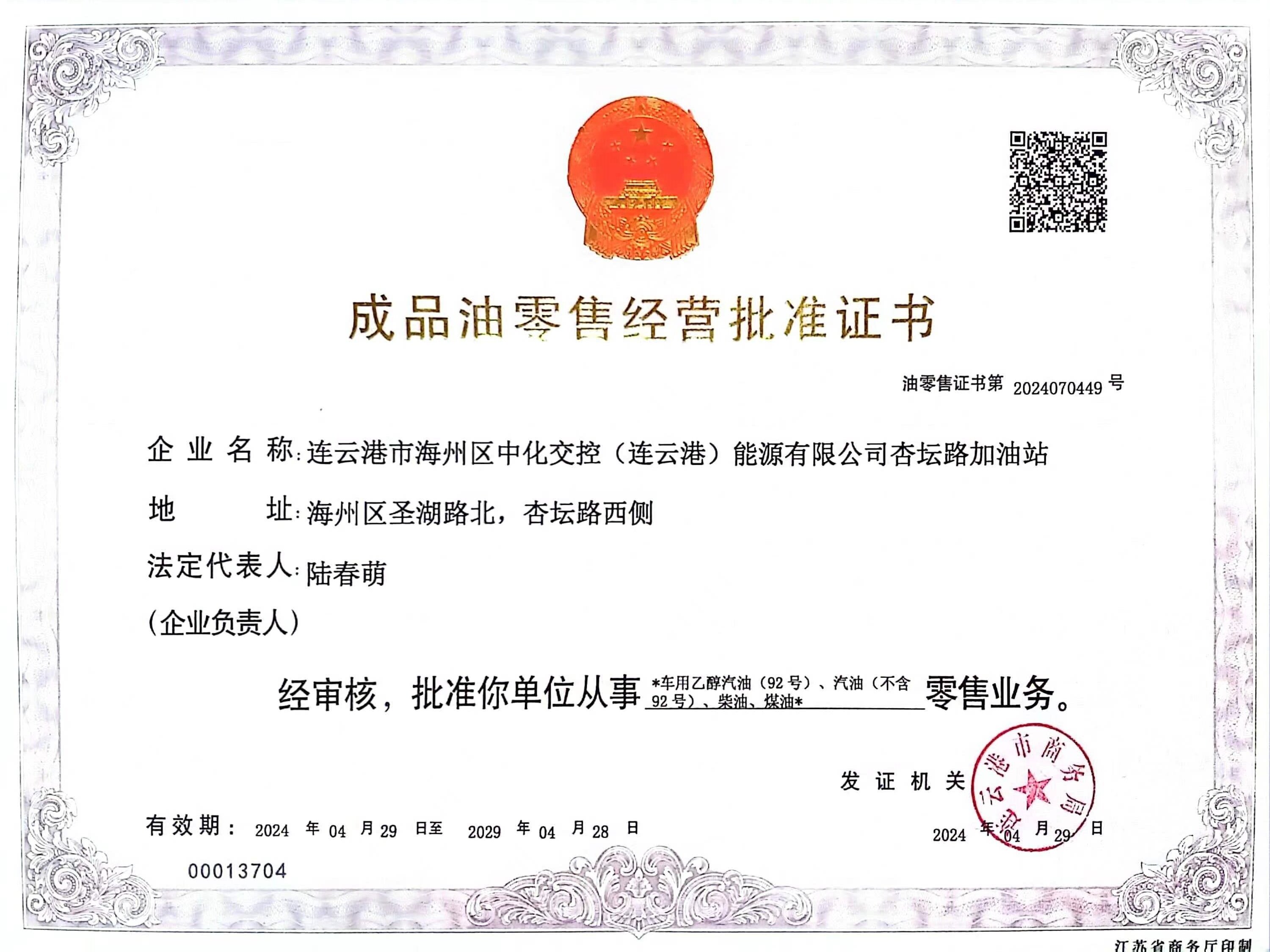 近日,经过公司各部门的通力协作,位于圣湖路北、杏坛路西的中化交控(连云港)能源有限公司杏坛路加油站顺利获取成品油零售经营批准证书,此次许可证书的顺利获取,标志着杏坛路加油站完成全部合规手续的办理,具备正式开业条件。
