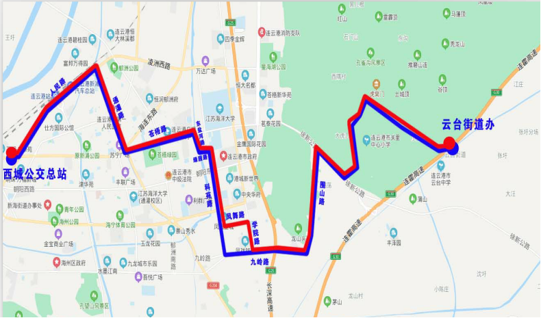 线路走向:西城公交总站—人民路—通灌路—海连路—苍梧路—东盐河路—绿园路—科苑路—凤舞路—学院路—九岭路—围山路—云台街道办