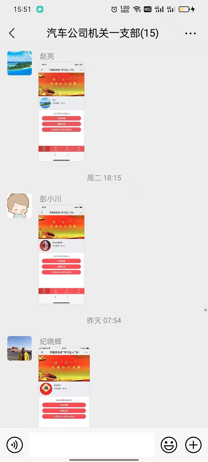 近日,晒得分、比收获成为汽车公司党员干部之间的讨论热点。自7月份连云港市国资委“学习达人”迎“七一”党建知识竞赛活动开始以来,汽车公司精心组织、创新形式、紧贴实际学习需求,充分调动广大党员干部学习参赛的热情,大家竞相学习打卡,共同营造“比学赶超”的浓厚学习氛围。