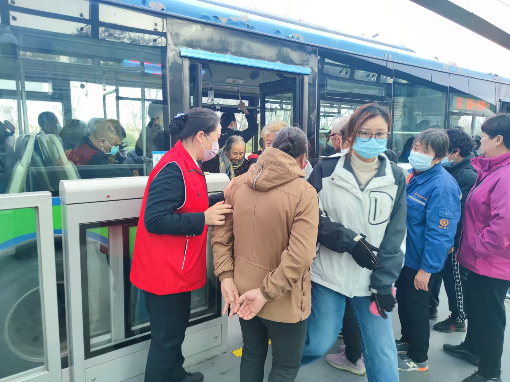 庙会前夕,快速公交事业部根据以往经验,第一时间安排机务人员对途经的B12线车辆进行了细致的检查和维护,确保车辆性能稳定、安全可靠;对周边站台的进站闸机、车载pos机等设施设备进行全面调试;分管运营、安全经理分别带队,现场对驾驶员进行了详尽的安全培训和指导,确保他们熟悉庙会期间的特殊交通状况,为乘客提供安全、舒适的乘车环境。同时为了应对客流高峰,公交集团在五羊路、出口加工区、朝阳以及体育中心等大客流站点部署了机动运力,随时准备应对突发情况。为了确保客流在站台不积压,在站台增加了数名志愿者。赶会群体多以老人居多,因此在进站闸机口、站内、安全门口到处都是红马甲的身影。她们有的搀,有的扶,将每位老人安全地送上车,还有的细心回答乘客每一个提问。乘客纷至沓来,她们及时的进行疏导,确保站台无大规模乘客滞留现象发生。
