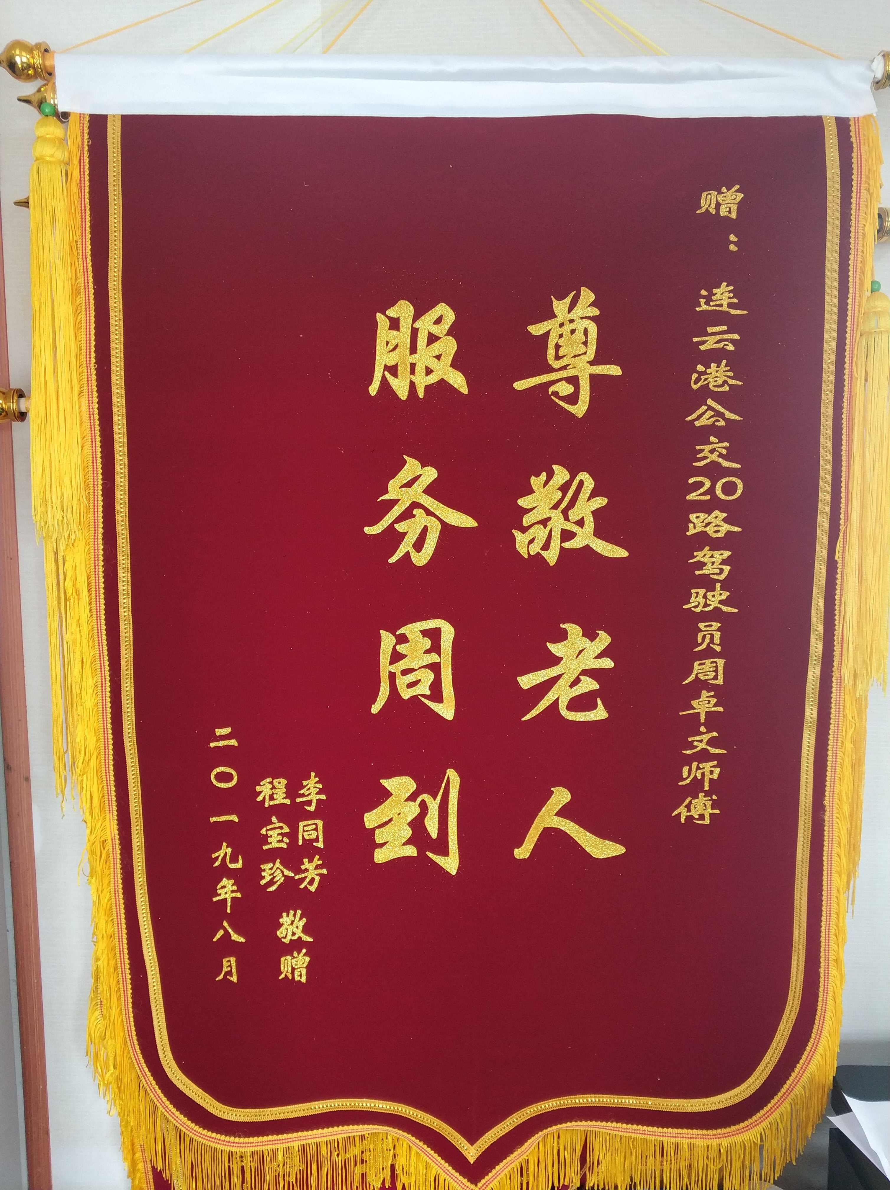 主动搀迎,帮扶行动不便的老人,用最实际行动温暖老人们的心田,20路驾驶员周卓文就用自己的行动逐步让“搀迎帮扶”成为20路全线驾驶员的工作常态,形成驾驶员的自觉行为。锦旗上的“尊敬老人、服务周到”彰显了公交20路高尚的品格和坚守的信念,为老年乘客和需要帮助的乘客提供方便,送上一片爱心,献出一份温暖。