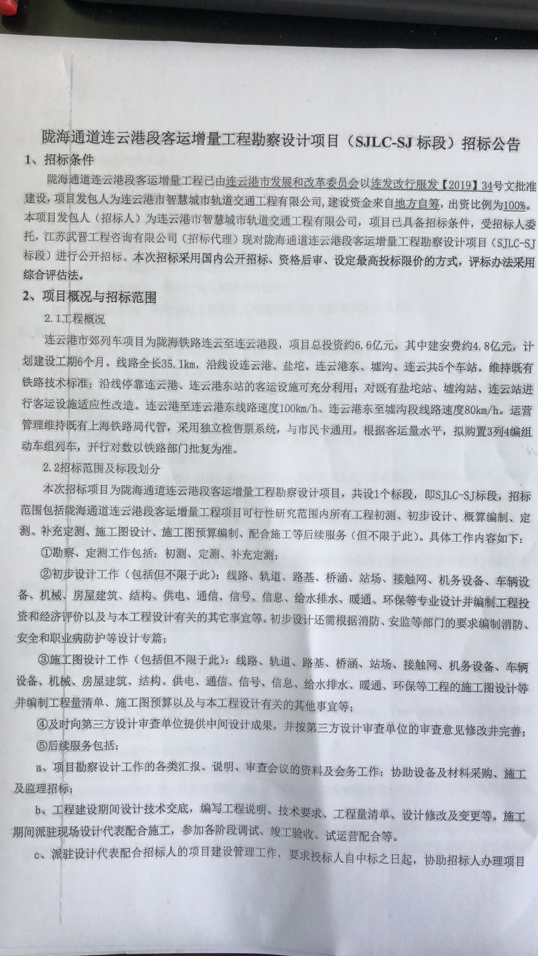 陇海通道连云港段客运增量工程已由连云港市发展和改革委员会以连发改行服发【2019】34号文批准建设,项目发包人为连云港市智慧城市轨道交通工程有限公司,建设资金来自地方自筹,出资比例为100%。本项目发包人(招标人)为连云港市智慧城市轨道交通工程有限公司,项目已具备招标条件,受招标人委托,江苏武晋工程咨询有限公司(招标代理)现对陇海通道连云港段客运增量工程勘察设计项目(SJLC-SJ标段)进行公开招标。本次招标采用国内公开招标、资格后审、设定最高投标限价的方式,评标办法采用综合评估法。