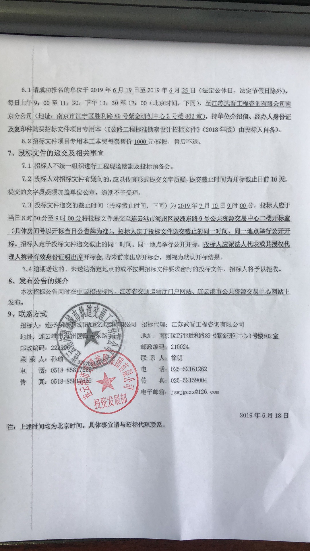 6.1请成功报名的单位于2019年6月19日至2019年6月25日(法定公休日、法定节假日除外),每日上午9:00至11:30,下午13:30至17:00(北京时间,下同),至江苏武晋工程咨询有限公司南京分公司(地址:南京市江宁区胜利路89号紫金研创中心3号楼802室),持单位介绍信、经办人身份证及复印件购买招标文件项目专用本(《公路工程标准勘察设计招标文件》(2018年版)由投标人自备)。