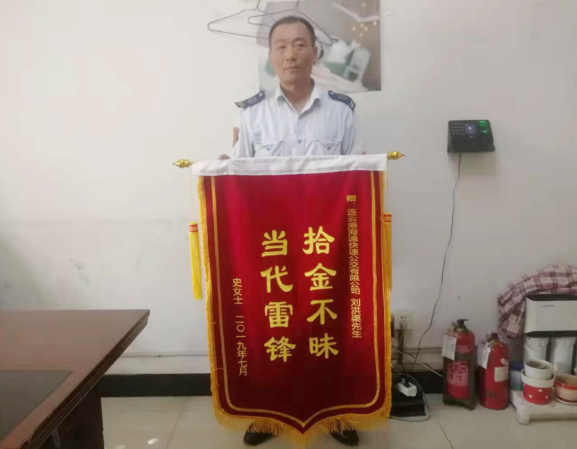 7月29日,史女士专门送来锦旗,锦旗上写的“拾金不昧,当代雷锋”是对刘洪渠师傅最美的赞扬。