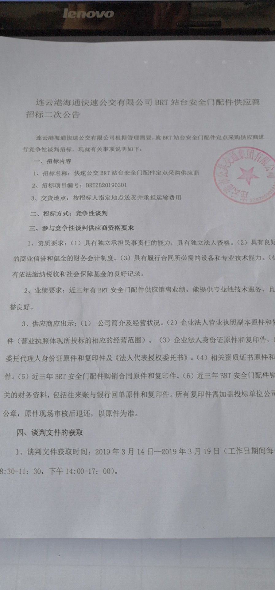 连云港海通快速公交有限公司根据管理需要,就BRT站台安全门配件定点采购供应商进行竞争性谈判招标,现就有关事项说明如下: