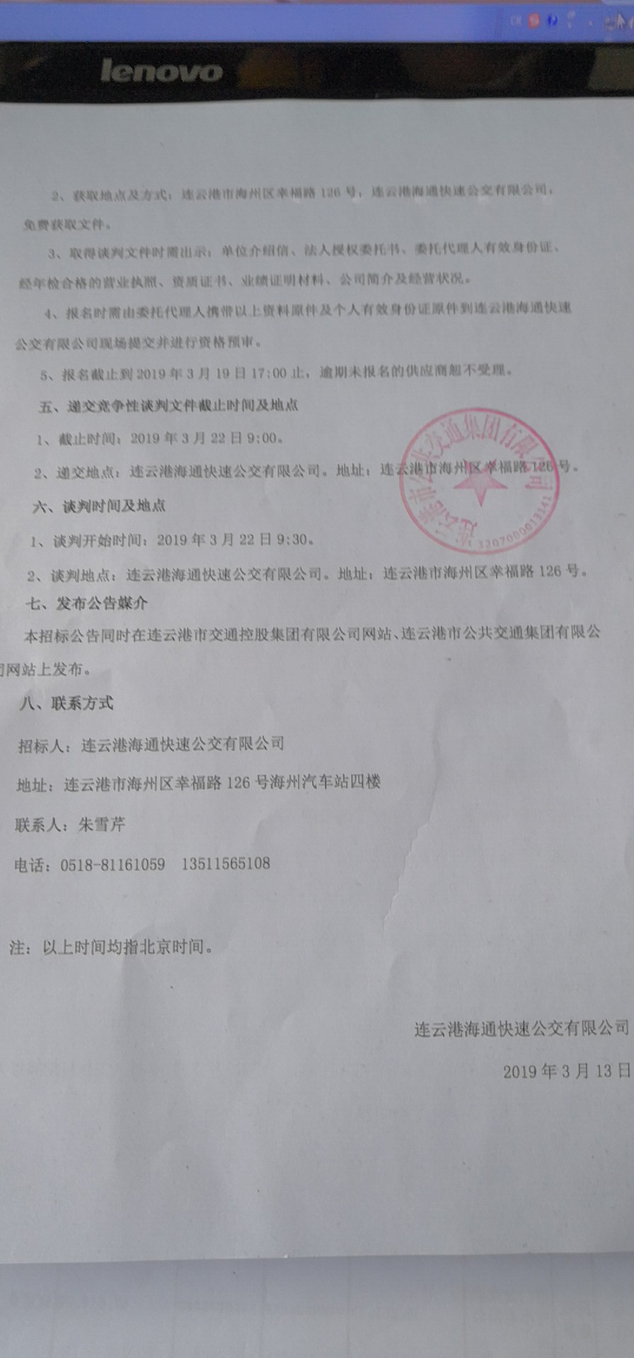 2、谈判地点:连云港海通快速公交有限公司。地址:连云港市海州区幸福路126号。