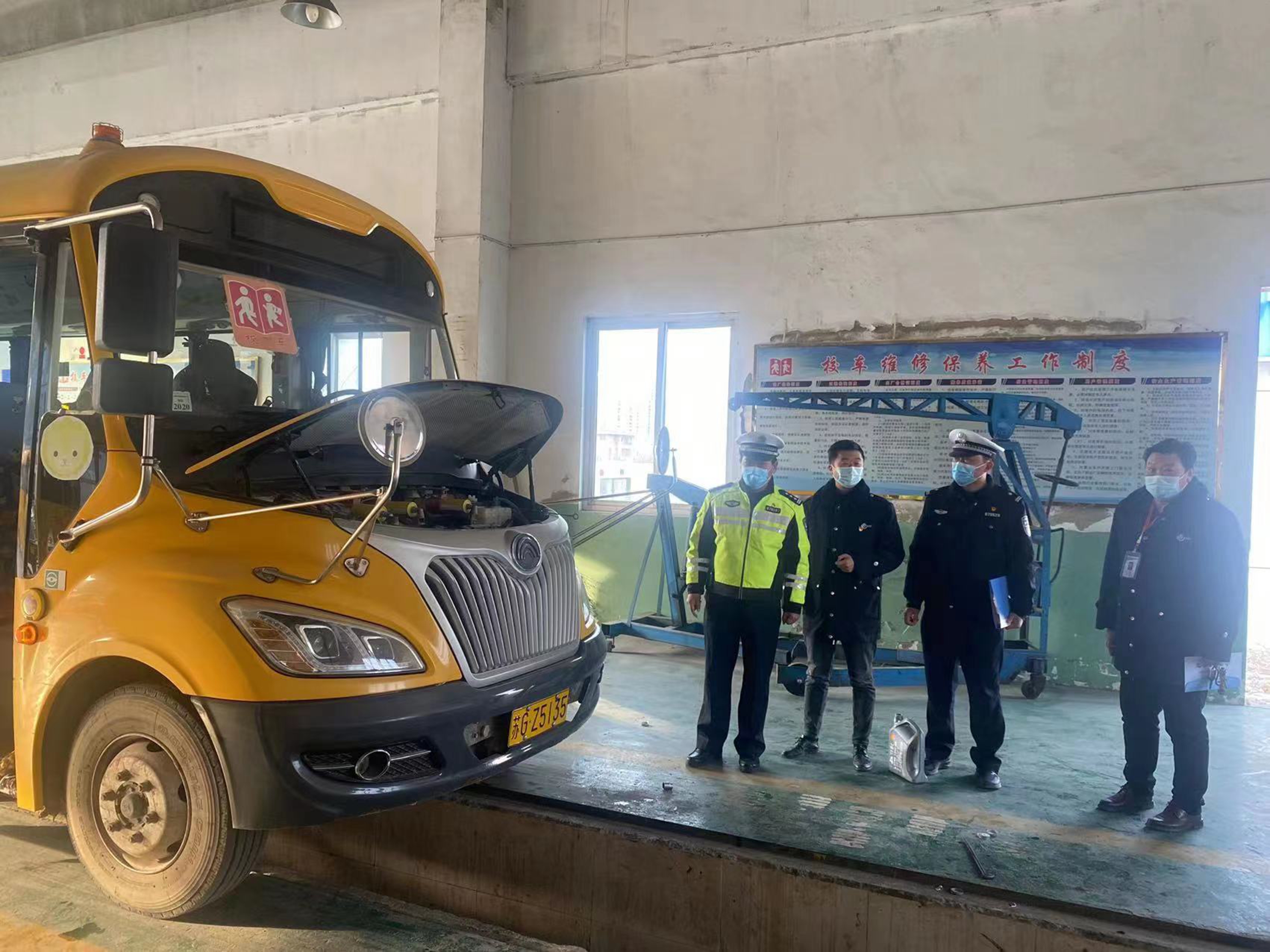欣达校车工作人员特邀请灌云县公安局交通警察大队车辆管理所警官、汽车公司安全与机务管理部、修理厂联合开展检查。在停车场内,一辆辆长鼻子校车依次排开,检查人员采用“逐一过堂”的方式,对校车车况和安全设施进行详细检查,逐一查看校车发动机、刹车、校车标志灯、灯光、停车指示标志等硬件是否正常运行,查看座位上每条安全带是否正常打开关闭、车窗上每一个逃生锤是否放置在原位、随车配备的灭火器是否过期、应急箱是否配备齐全、安全逃生门是否开启正常等,坚决杜绝校车“带病”上路。对存在隐患的校车下发整改通知单,并要求立即整改到位。