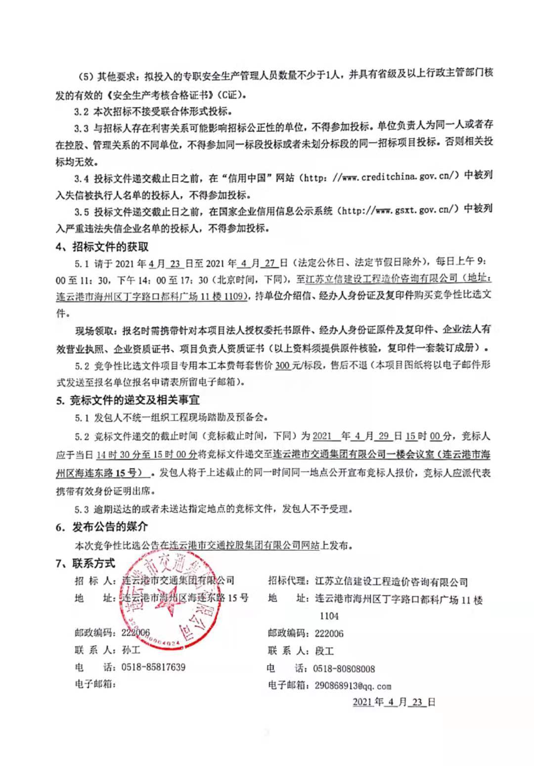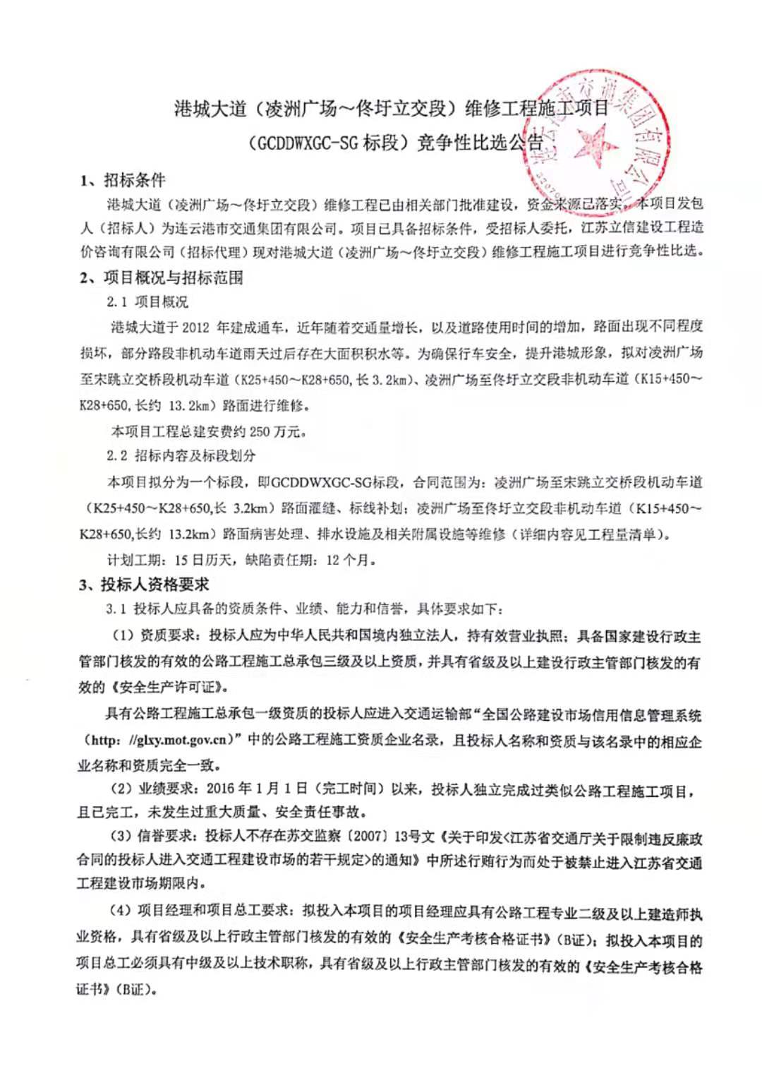 招 标 人:连云港市交通集团有限公司 招标代理:江苏立信建设工程造价咨询有限公司