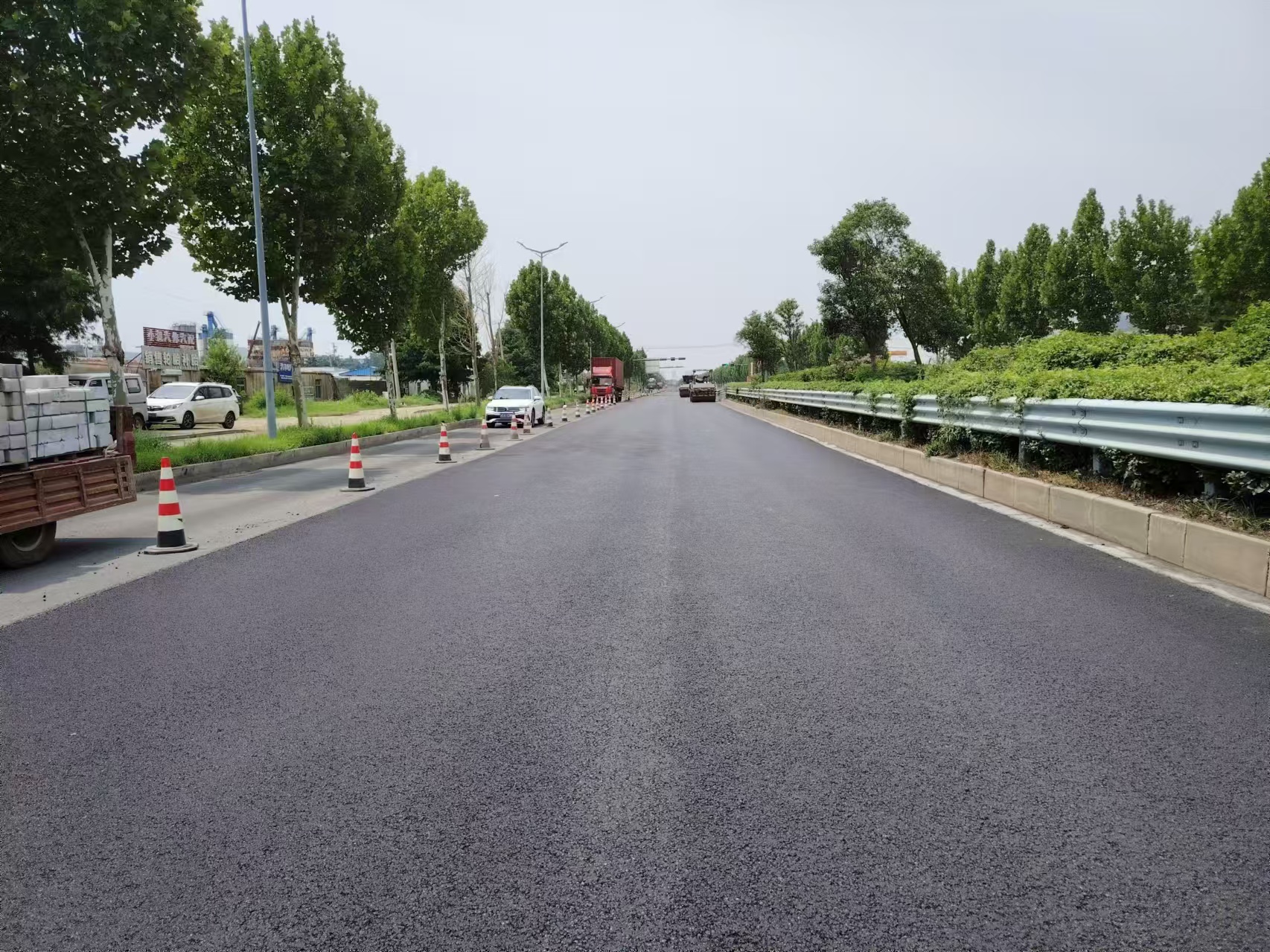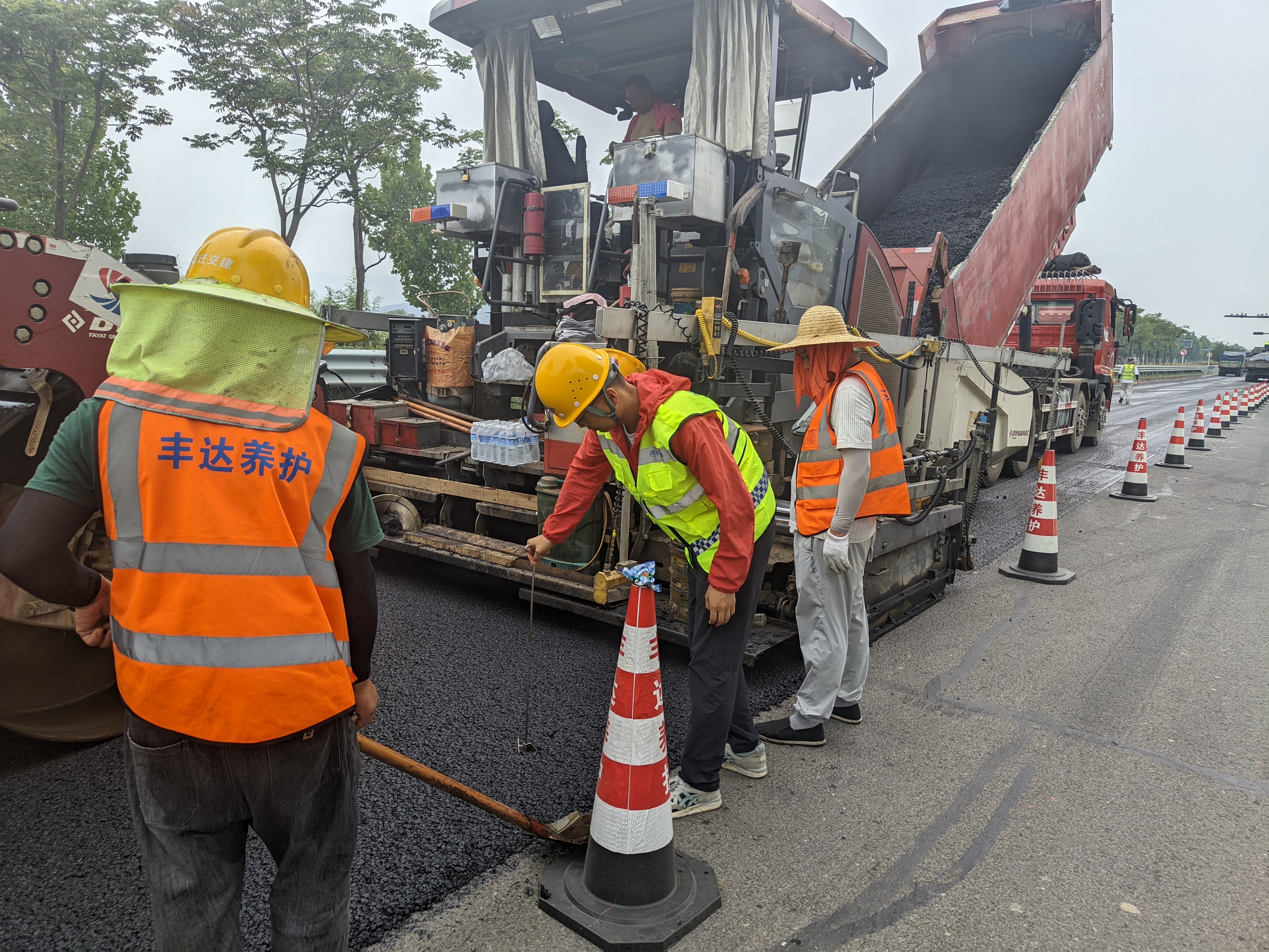 228国道过境车辆多,交通压力大,且不能全封闭施工。全体参建人员严格按照标准化施工要求,采取早晚错峰施工方式,战高温、克难点、保节点,抢抓有效工期。在保质保量保安全的前提下,用15天时间完成了10公里的高模量沥青混凝土摊铺任务,以最快的速度为周边市民出行创造了良好的通行环境。