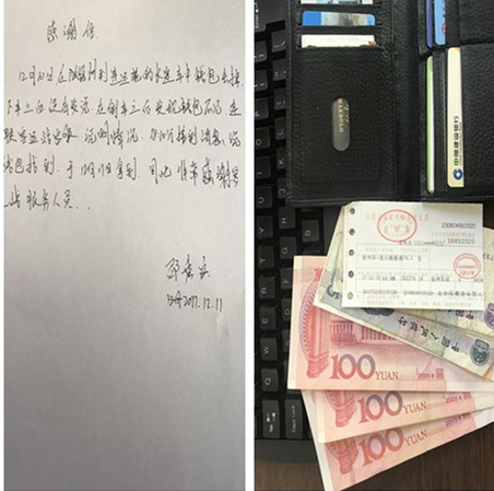 12月11月,在运调中心,经过身份核实,该包确系邵先生丢失的,邵先生拿着失而复得的钱包心情无比激动,递上感谢信:“谢谢快客公司,谢谢“雷锋车”的孙常洲师傅”。