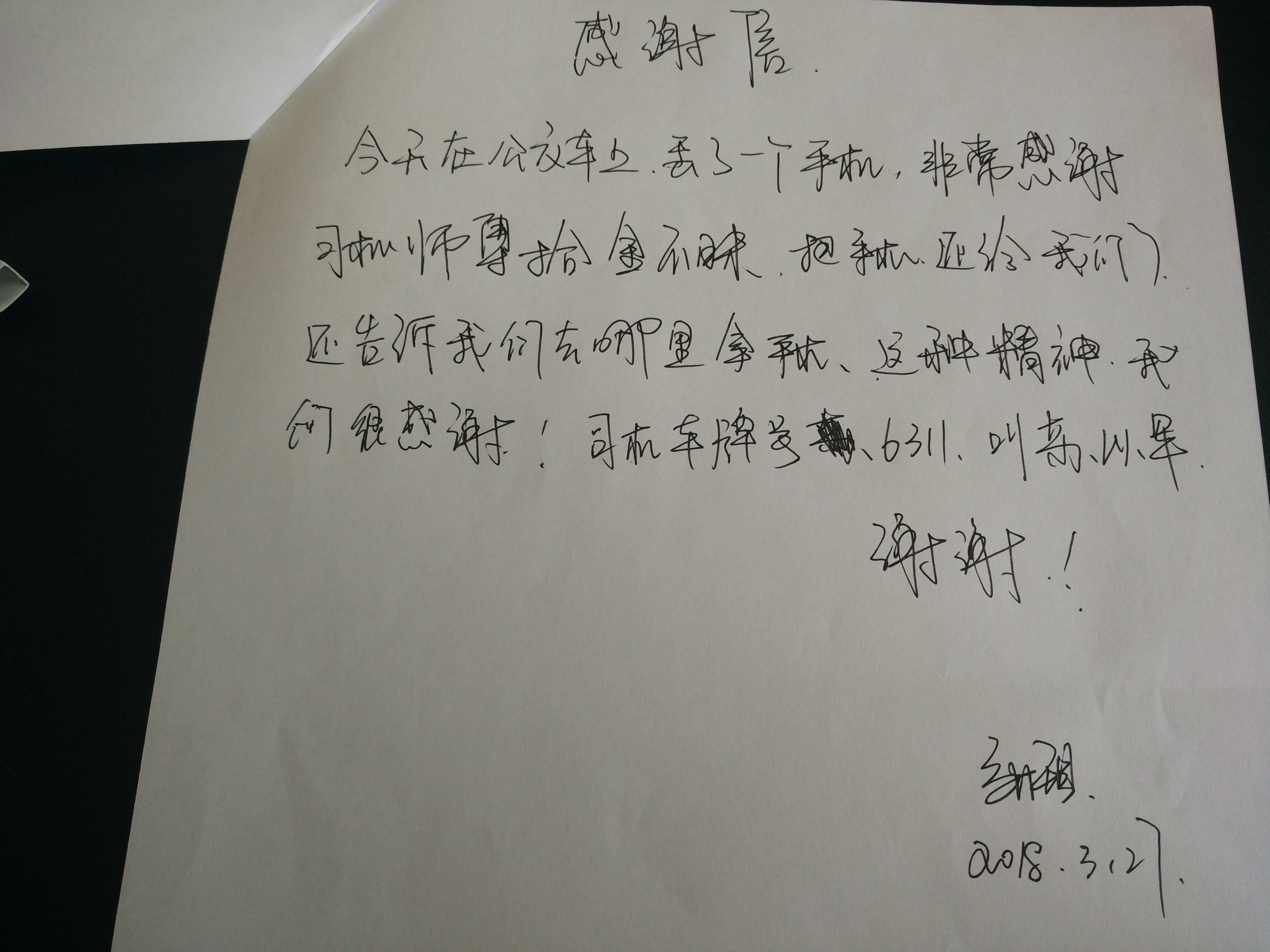 3月27日,乘客张女士乘坐公交601路至墟沟时,因下车匆忙不慎将苹果手机丢失在车上,车辆到达终点站后,驾驶员苏以军发现了该手机并及时交至公司办公室。同时,张女士经过多方联系到公交集团东部公司办公室,得知丢失的手机在公交公司时,她非常激动。领取手机后,她当场写下感谢信,感谢驾驶员苏以军师傅拾金不昧的崇高品质。