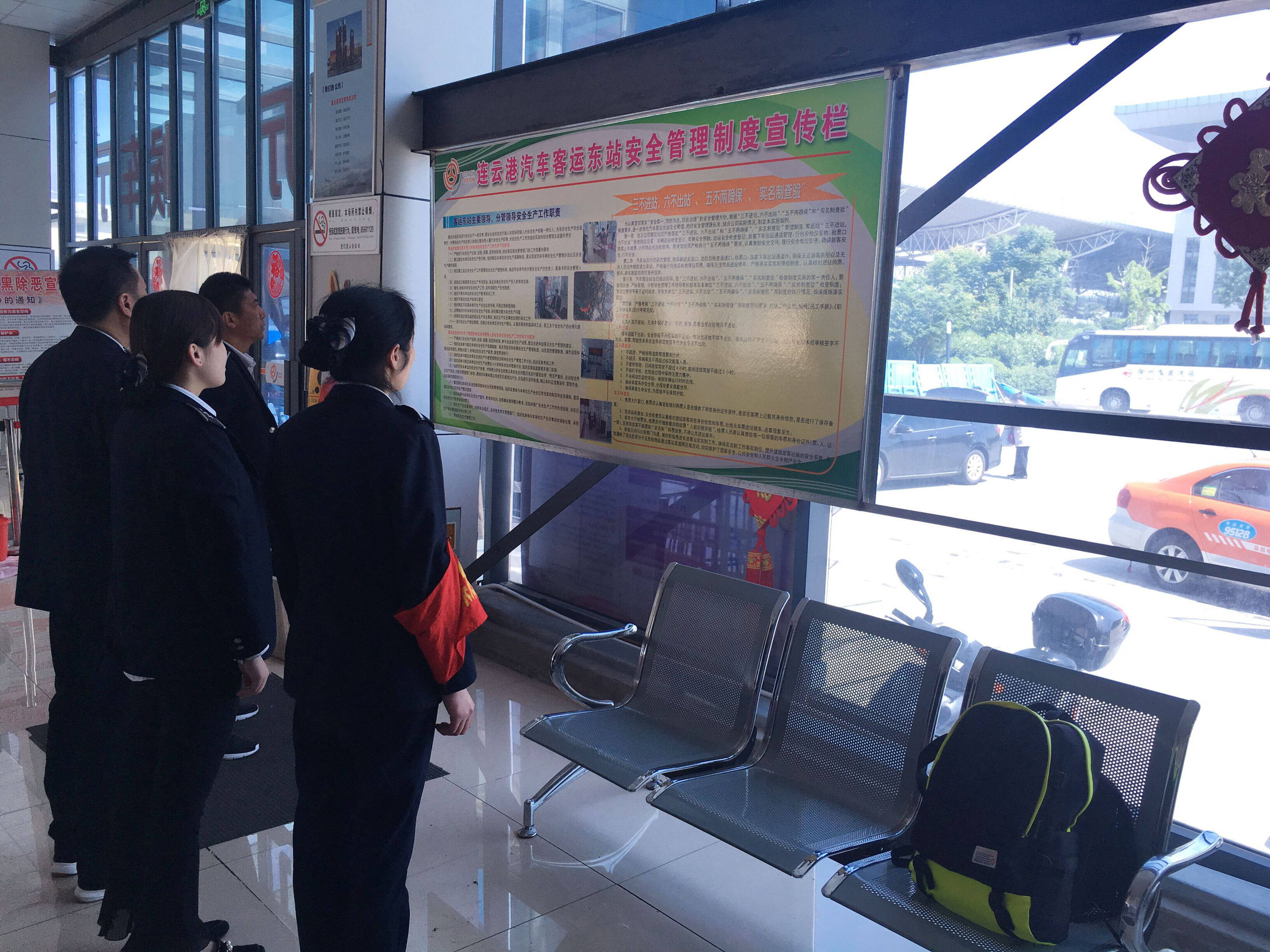 为认真贯彻落实“安全第一,预防为主,综合治理”的安全管理方针,根据“三不进站,六不出站”、“五不两确保”和“实名制查验”制度要求,强化汽车客运东站安全管理,把好班组作为生产安全管理一线的源头关,5月22日,连云公司深化和拓展“六型班组”活动内涵,对各车站的班组安全生产运行状况进行了再次分工部署,强调了班组日常安全学习的重要性,推出了“班组安全学习一日一题一答”新模式,要求每位组员积极参与,每天认真做好笔记,每周组织一次安全检查,同时将安全管理相关制度制作成宣传图板,让职工在日常的经营活动中随时随地接受安全知识教育,从而在思想上筑牢安全防线,提升班组全员安全生产意识,确保旅客安全、行车安全。