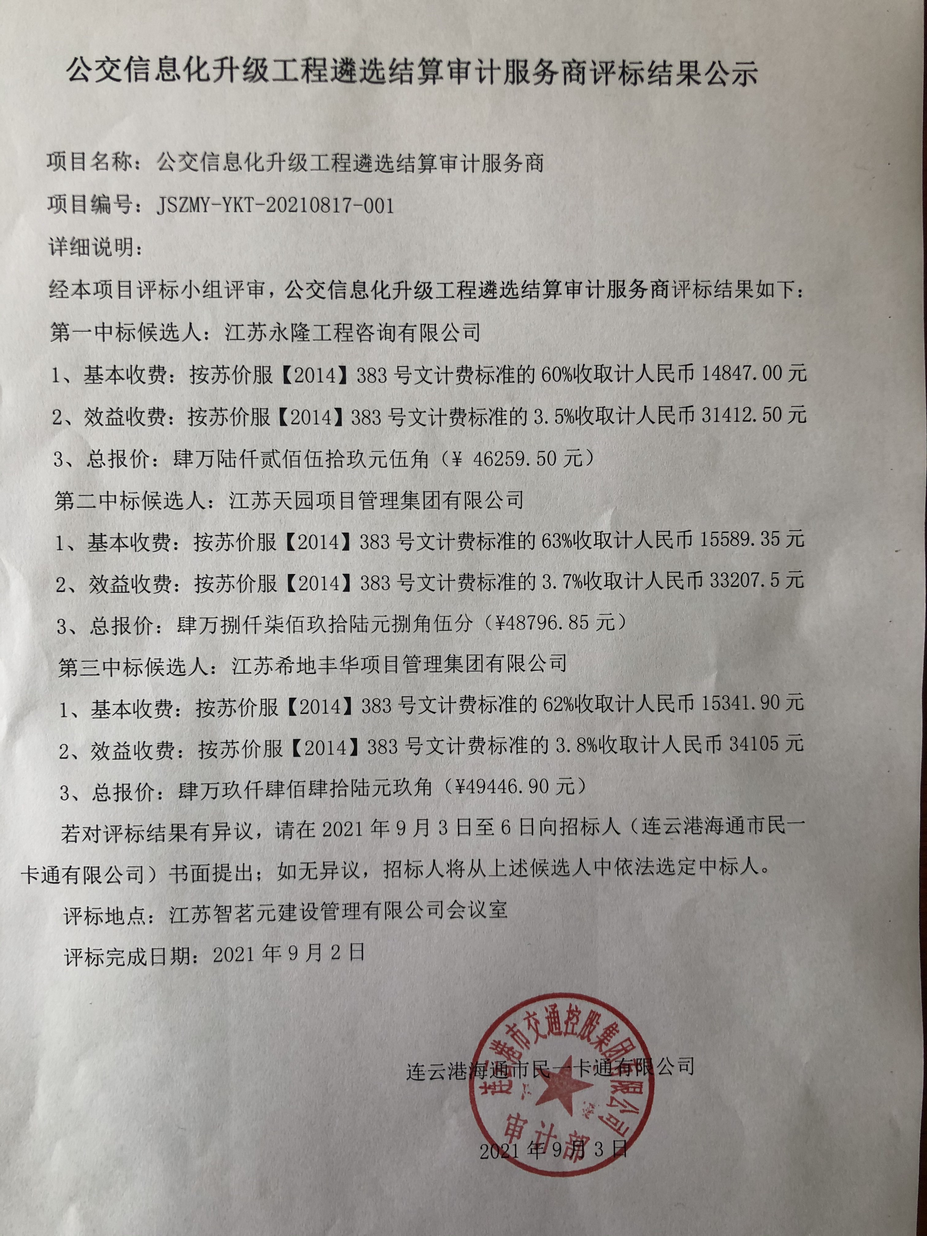 经本项目评标小组评审,公交信息化升级工程遴选结算审计服务商评标结果如下: