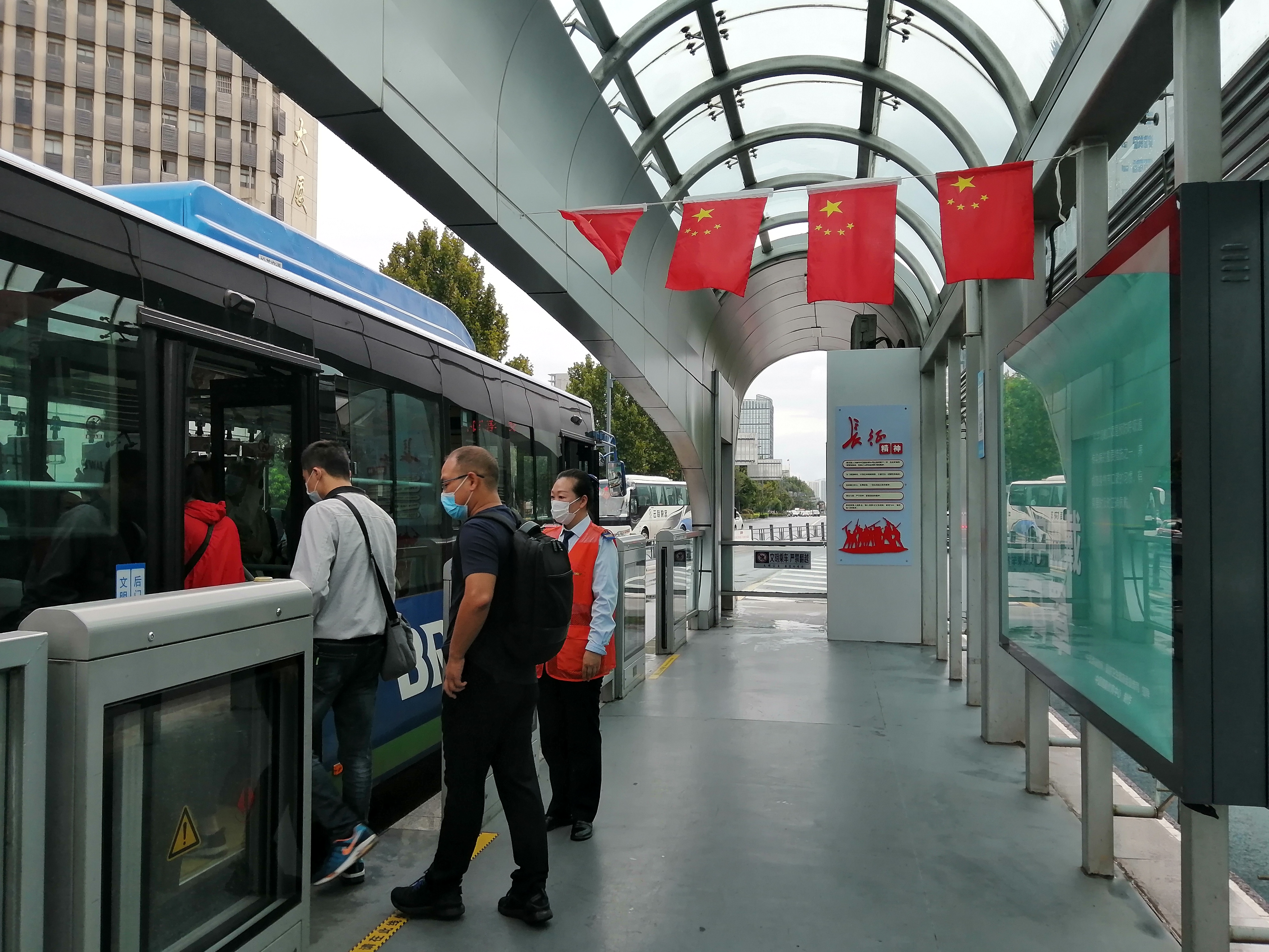 国庆期间,公交集团共组织140名公交先锋志愿者在大客流量站台、高铁站、花果山景区等重要站点,维护秩序、解答线路问询、引导乘客排队乘车以及帮助特殊乘客上下车等志愿服务活动。