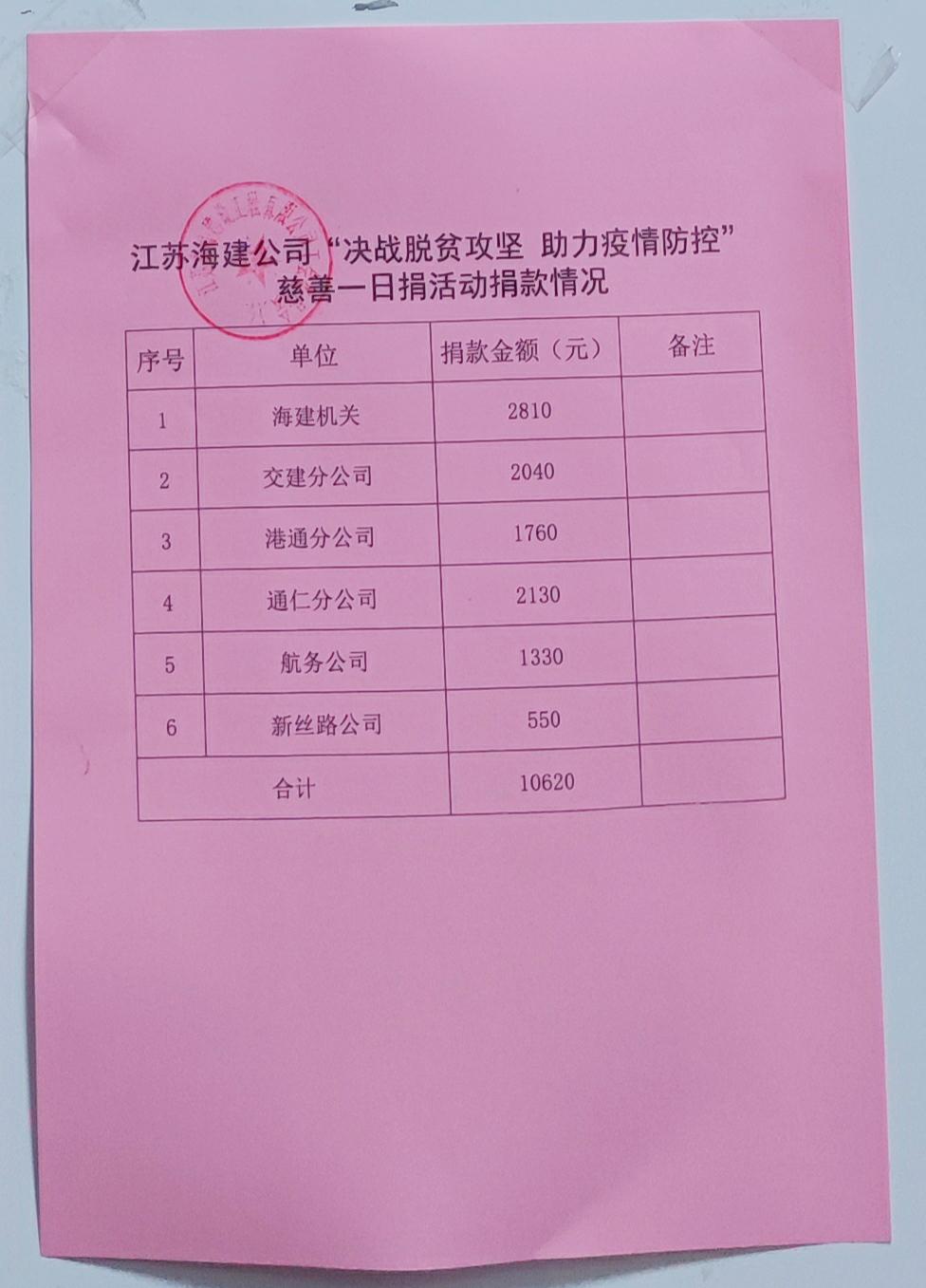 为大力践行社会主义核心价值观,以实际行动弘扬慈善精神,为贫弱困难群体排忧解难,充分发扬人文关怀主义,根据集团安排,11月11日至20日,海建公司积极开展“决战脱贫攻坚、助力疫情防控”慈善一日捐”活动。