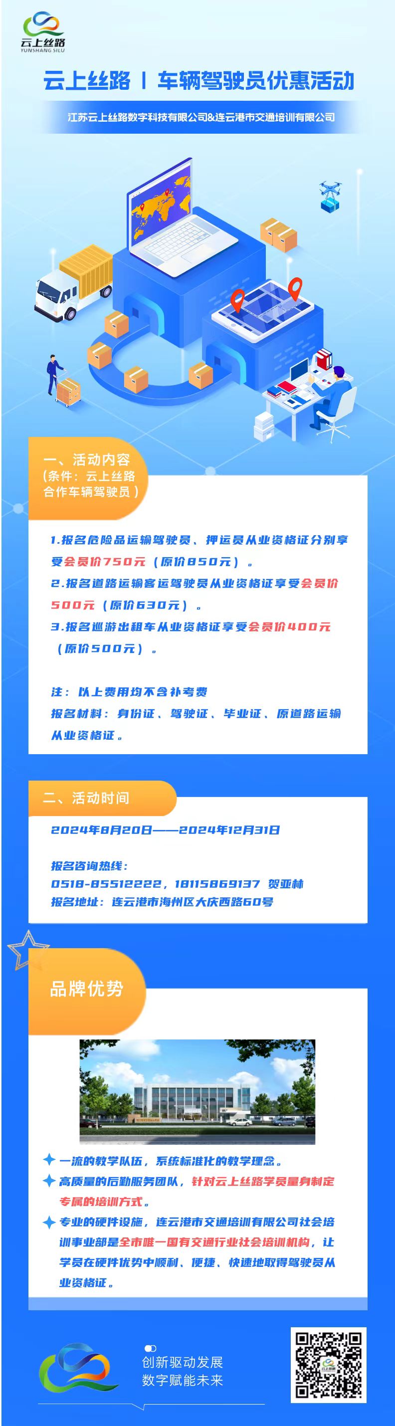 此次与“云上丝路”合作,包含危险品运输驾驶员、危险品运输押运员、普通道路运输客运驾驶员、巡游出租车等在内的从业资格证培训优惠活动,让更多的驾驶员能够享受高质量的培训。并为参与活动的驾驶员准备了丰富的学习资料以及贴心的后续服务。通过“云上丝路”广阔的宣传平台与渠道,将此次优惠活动的信息迅速传播出去,让更多的驾驶员知晓并参与其中。