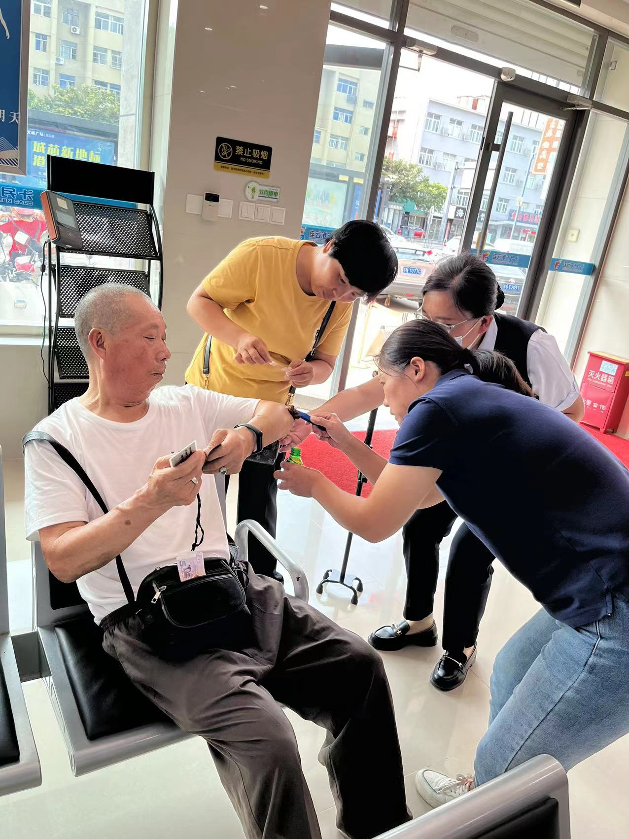 营业厅工作人员帮助老人办理完免费乘车卡后,主动联系老人的家人,二十分钟后顾客家属来到,营业厅工作人员再次交代了相关业务处理方式和顾客伤口的情况。在顾客的再三感谢下,工作人员把顾客安全送出营业厅,并告知他们在路上注意安全。