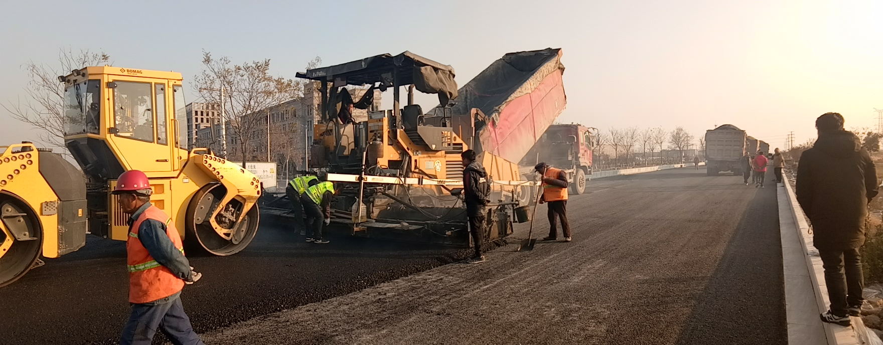 项目部积极组织相关人员开展质量、安全技术交底,在具备施工条件后,立即展开了作业施工。在施工中,项目部安排人员、机械全力配合,技术、质量、安全管理人员全程跟进。针对本次沥青铺筑任务,项目部连班作业,加大人员及其他辅助性机械设备投入,要求测量、技术、质量人员全程对作业人员进行控制、指导和监督。在整个摊铺过程中,配合监理及第三方检测单位落实各项试验检测,加强对混合料配合比、平整度等技术质量指标控制,确保高质量、高标准完成本次沥青试验段摊铺作业。
