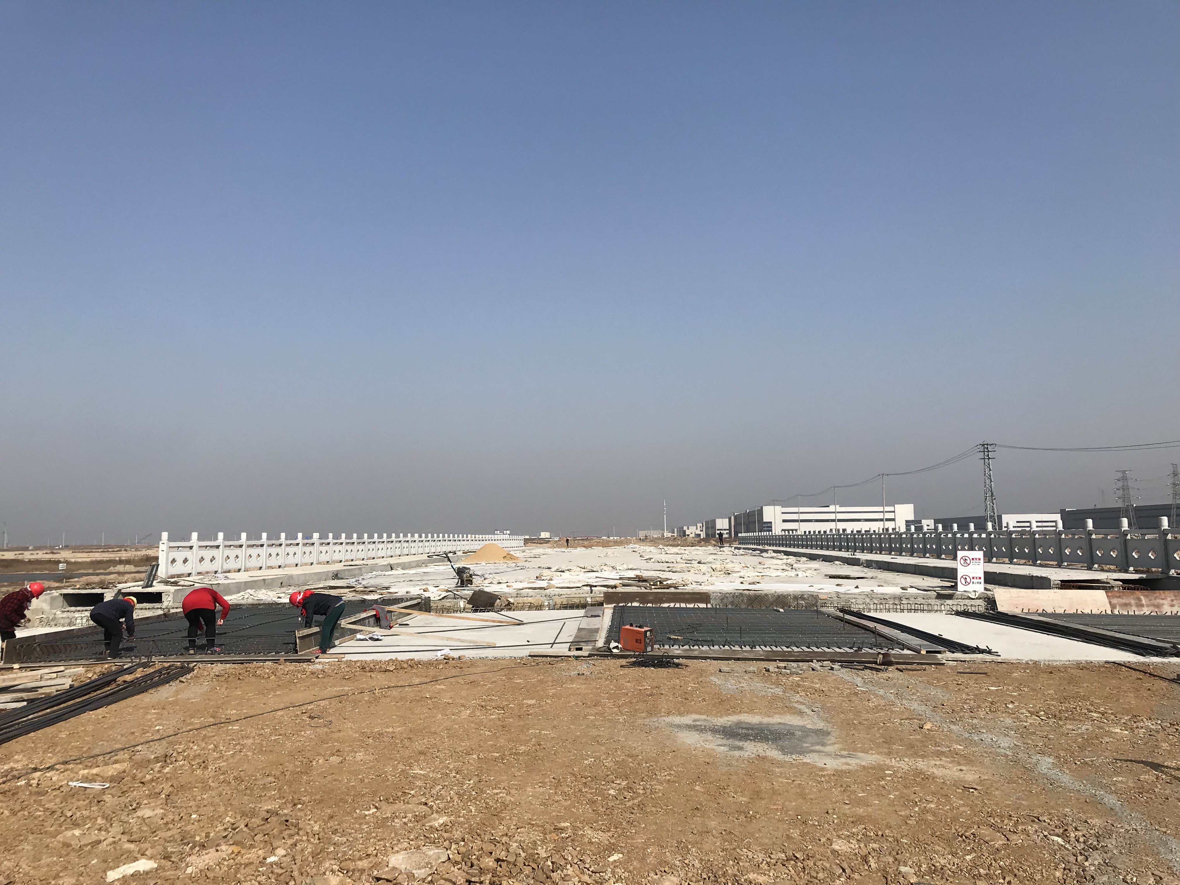 2018年4月10日上午,江苏海建节能一路跨方洋河桥进行搭板钢筋绑扎施工。跨方洋河桥两侧搭板尺寸为8m长*27.54m宽*0.4m高,预计一周内完成搭板施工。截止至目前,节能一路工程完成工程量约4800万元,占合同总价57%,剩余工程量为3638万元,计划完工日期为2018年6月10日。