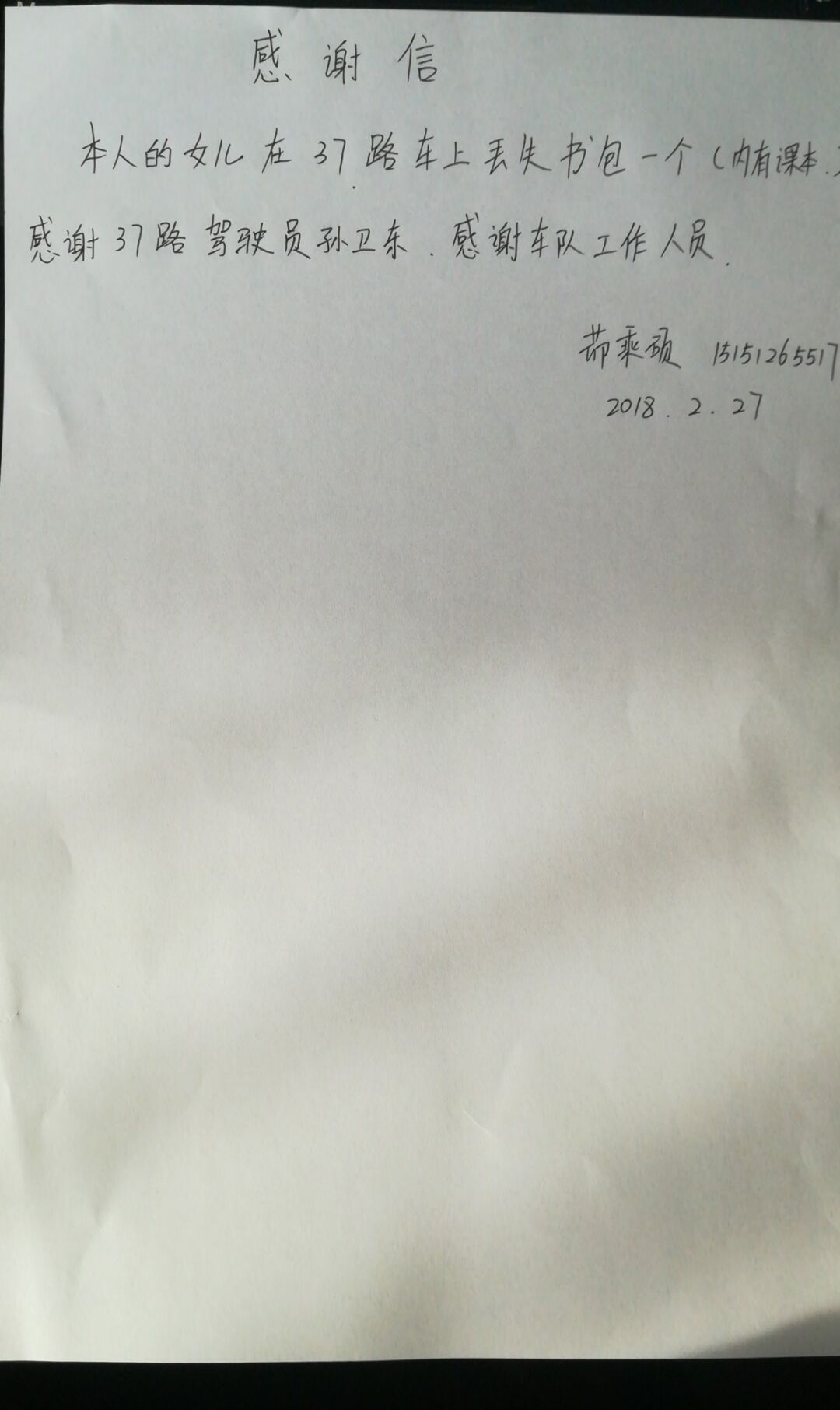 近日,乘客茆先生的女儿中午放学时乘坐公交集团37路车时,因下车匆忙将女儿的书包遗失在车上,驾驶员孙卫东到站打扫车内卫生时发现了该书包并及时交至车队。乘客茆先生经过联系,得知丢失的书包在公交公司车队,在领取书包时当场写下感谢信,对孙师傅以及公交公司车队管理人员的热心帮助表示感谢。