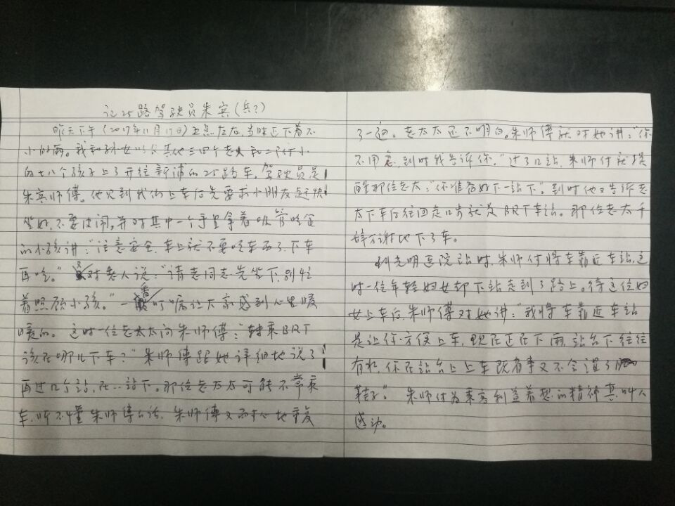 方老先生在信中写到,11月17日下午5点左右,当天正好下着小雨,方老先生与其孙女以及其他三四个老年人,还有二附小的八九个小学生一起乘坐了开往新浦方向的25路公交车,驾驶员为朱兵,方老先生一群乘客上车后,驾驶员就和蔼地让小朋友们在座位上坐好,注意安全。对老年人亲切地说,“请老同志们先坐下,别忙着照顾小朋友,一定要坐稳,注意安全”。朱师傅的一番叮嘱,让这群老年乘客心里感觉暖暖的。有位老太太询问如何转乘BRT,朱师傅又详细地向老太太叙说着,到那个站,如何转乘至BRT车。因老太太不经常乘坐公交车,一开始没听懂,但是朱师傅不但不嫌麻烦,而且还把如何转乘的情况,重复说了好多遍,直到把老太太送下车又交待了如何转乘BRT为止,下车时老太太千恩万谢的招手离开。当车辆行驶至光明医院站时,朱师傅见站台上有不少乘客,就将车辆靠近站台停车,朱师傅表示,下雨天站台下面有积水,怕乘客走下站台上车,一是会将鞋弄湿,二是站台边上被雨淋湿,乘客踩上会出现打滑、摔倒等现象。朱师傅将车停靠站台近,方便乘客上车鞋不湿,脚下不打滑。车上乘客听完朱师傅的话,心里顿然升起对朱师傅敬佩之情。此外,虽然车厢内都有语音报站,但是每到一站,朱师傅还是要口头报站一次,生怕在车上玩手机的乘客或正在聊天的小学生坐过站。