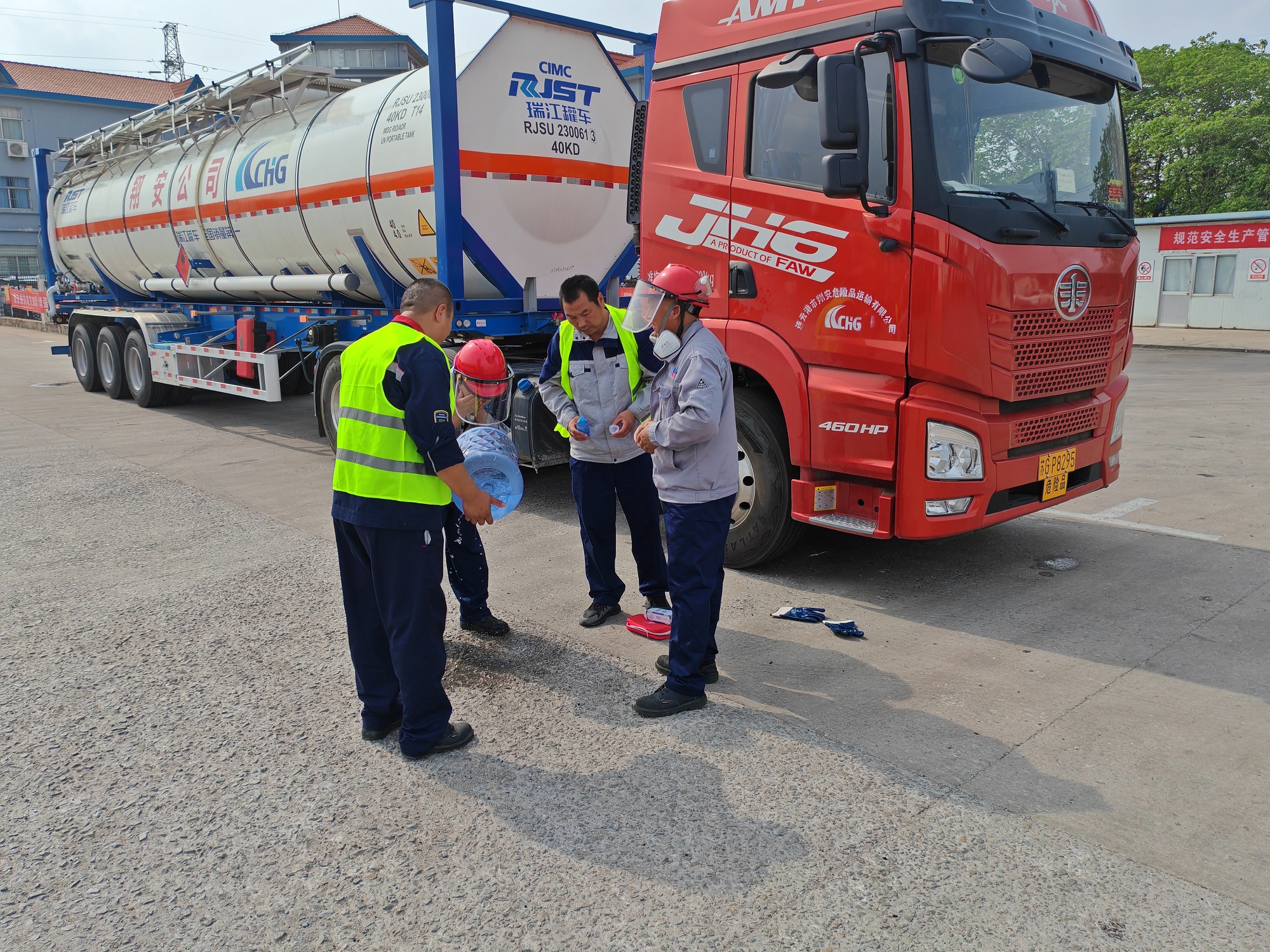 本次模拟演练内容为:危险品运输车苏GQ0290(丙烯腈)正常卸货期间,因驾驶员张正水未严格执行丙烯腈操作规程,卸车前未正确检查法兰接口密封性且未正确穿戴个人防护用品,卸车期间因操作不当导致丙烯腈喷溅至驾驶员张正水手臂、眼睛等部位并有少量丙烯腈吸入、卸货现场发生丙烯腈轻微泄漏为背景展开。