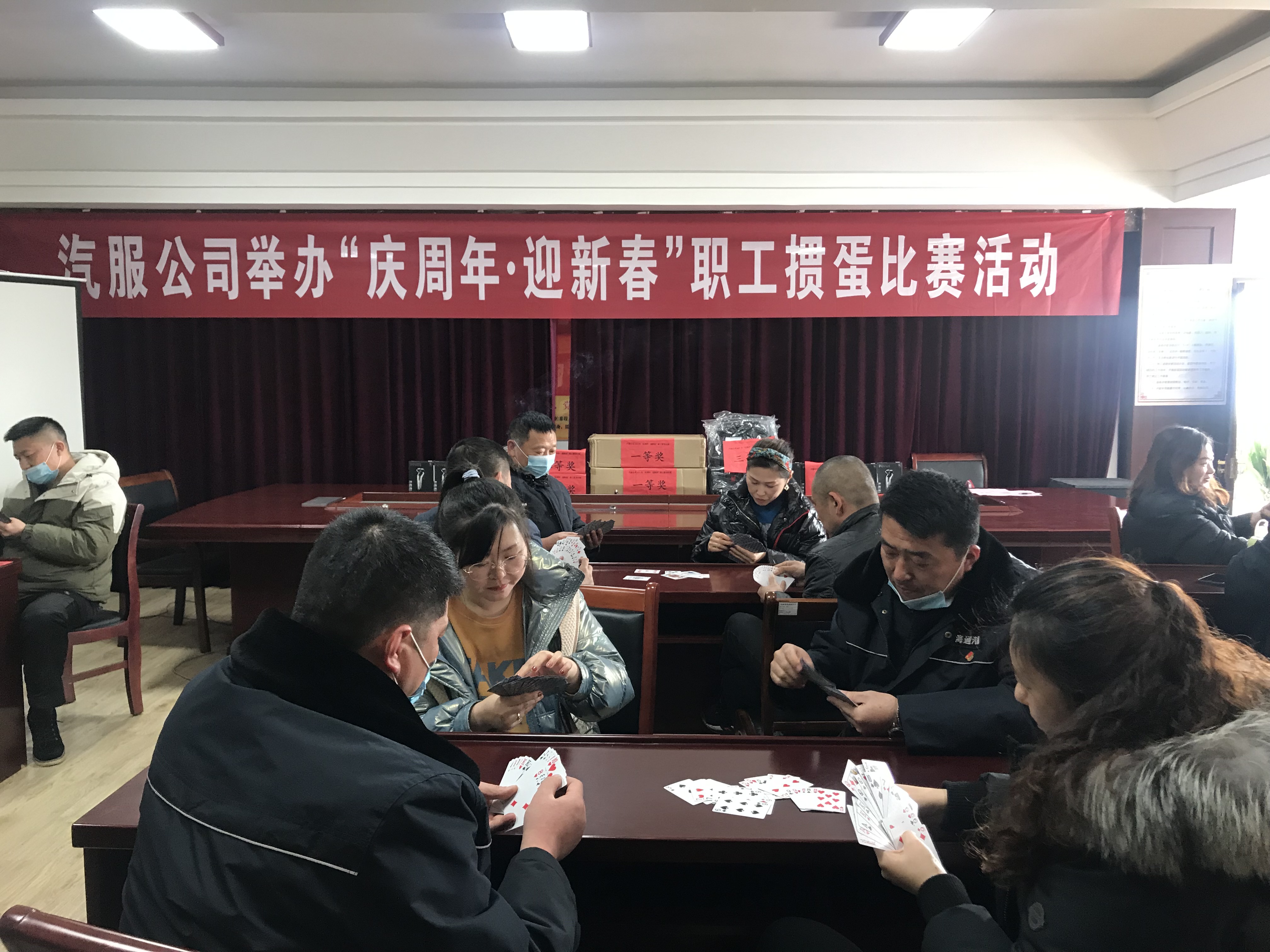 玉鼠报喜辞旧岁,金牛纳福共迎春!为庆祝汽服公司成立八周年及迎接2021年新年的到来,公司工会于2月10日在会议室举办了“庆周年·迎新春”职工掼蛋比赛活动。在公司党委、总经理室的大力支持下,在疫情防控的要求下,公司工会组织了24名干部职工戴好口罩、做好体温监测参与此次活动。