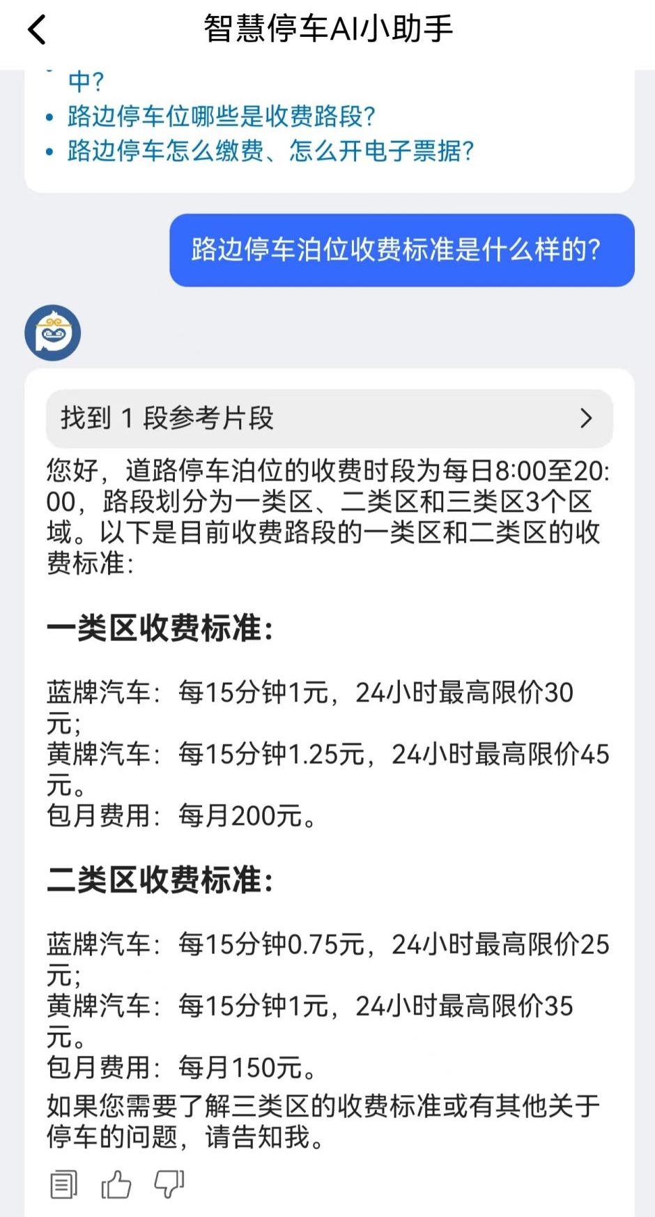 核心功能覆盖全场景,精准响应市民需求。“智慧停车AI小助手”提供 7×24 小时智能应答服务。市民只需通过文字或语音输入,就能即时获取停车费规则、路段收费信息、电子发票开具方法等高频问题的解答,彻底告别等待传统人工客服的漫长时间。