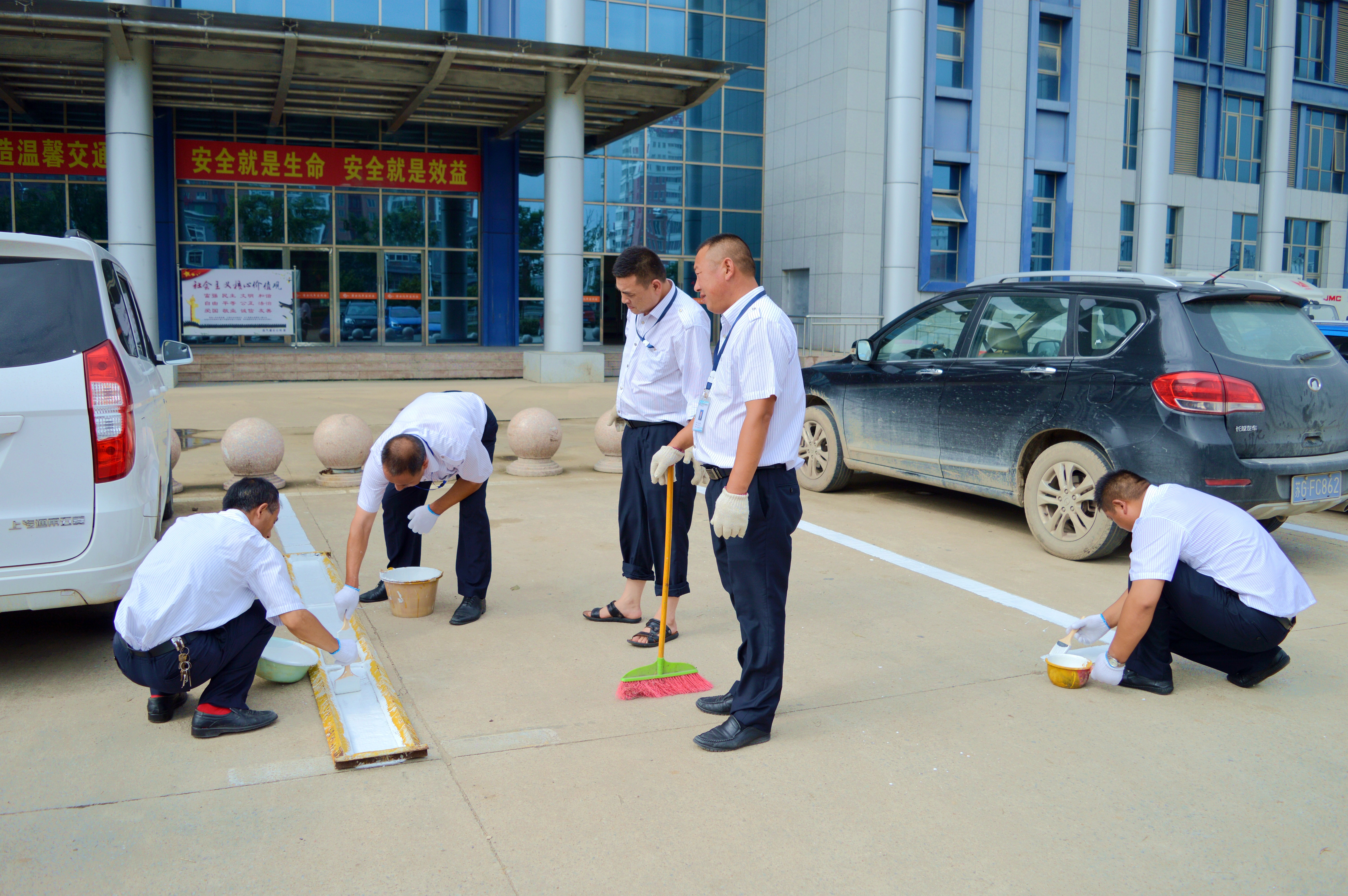 灌云客运站站前广场停车线年限已长,很多车位线已经模糊不清,一辆车占用两个车位的情况时有发生,由此引发一些矛盾与不和谐。为了让来往司机能够文明、有序地停车,灌云公司领导班子组织稽保科员工购买油漆在原有的停车位上重新画线,便于司机更加准确地将车停至停车线内。