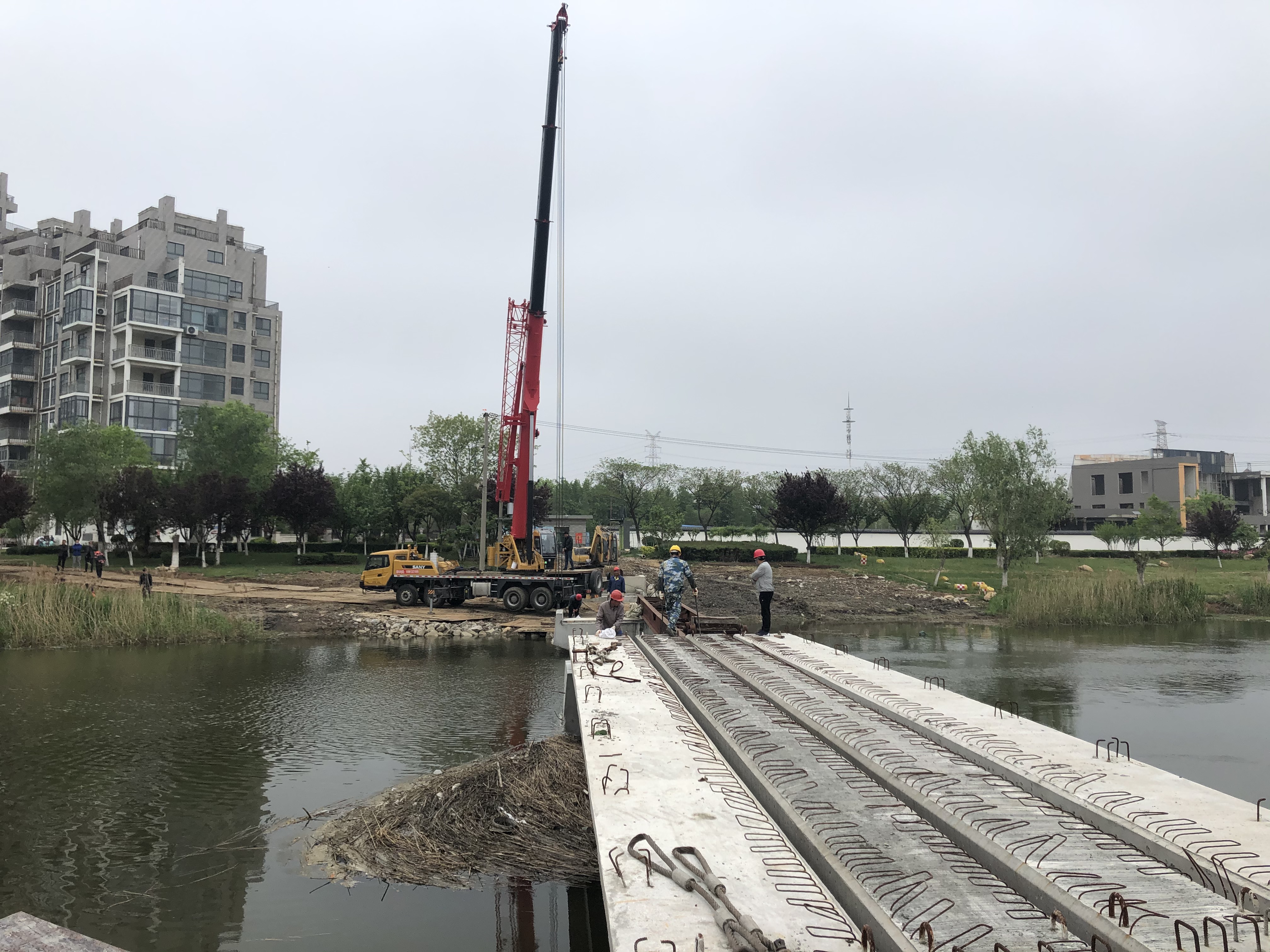 板梁的架设完成标志着跨排淡河人行桥工程完工已进入倒计时。项目部将继续严格做好质量安全管理工作,争分夺秒,争取提前完成施工任务。