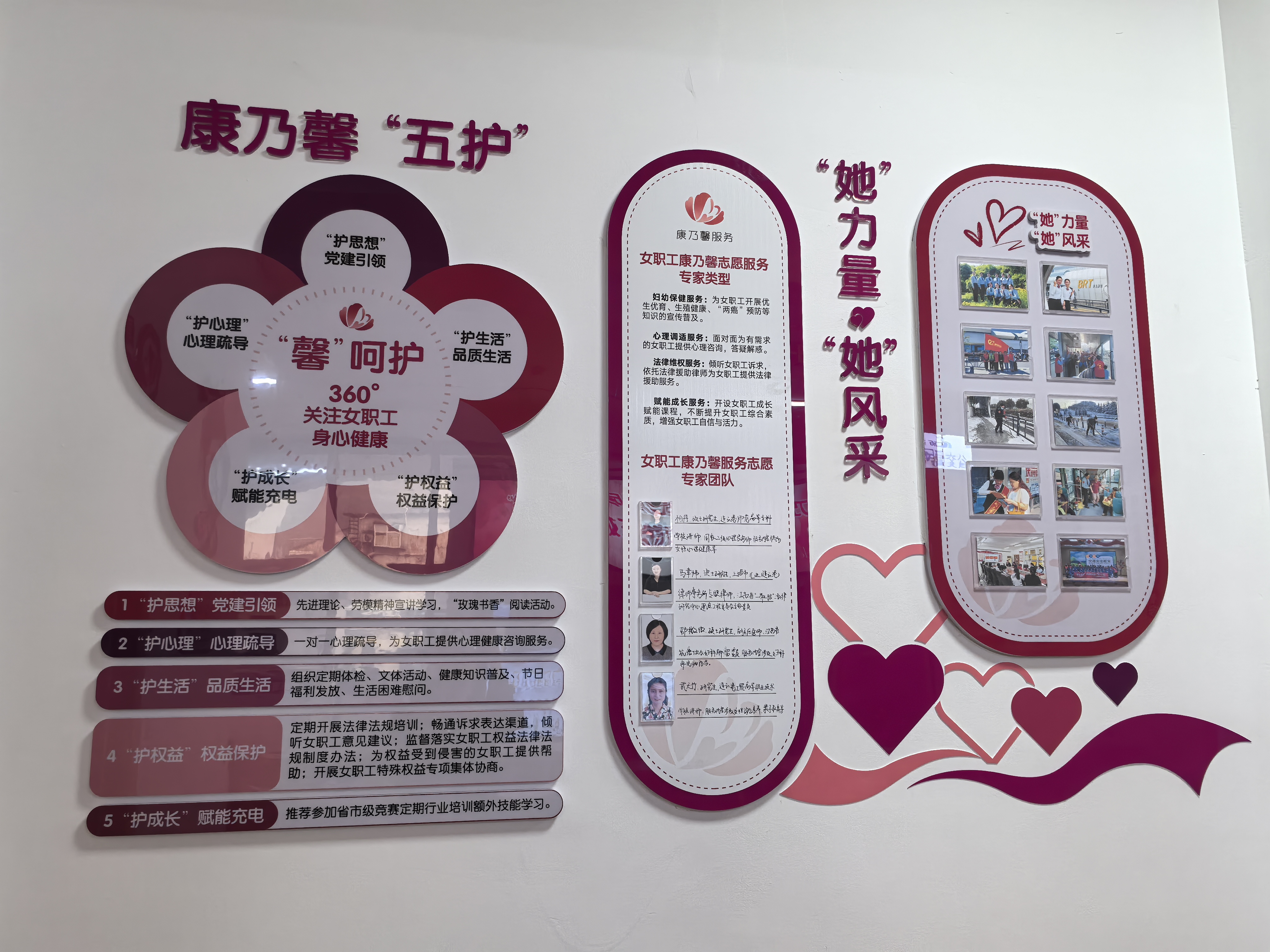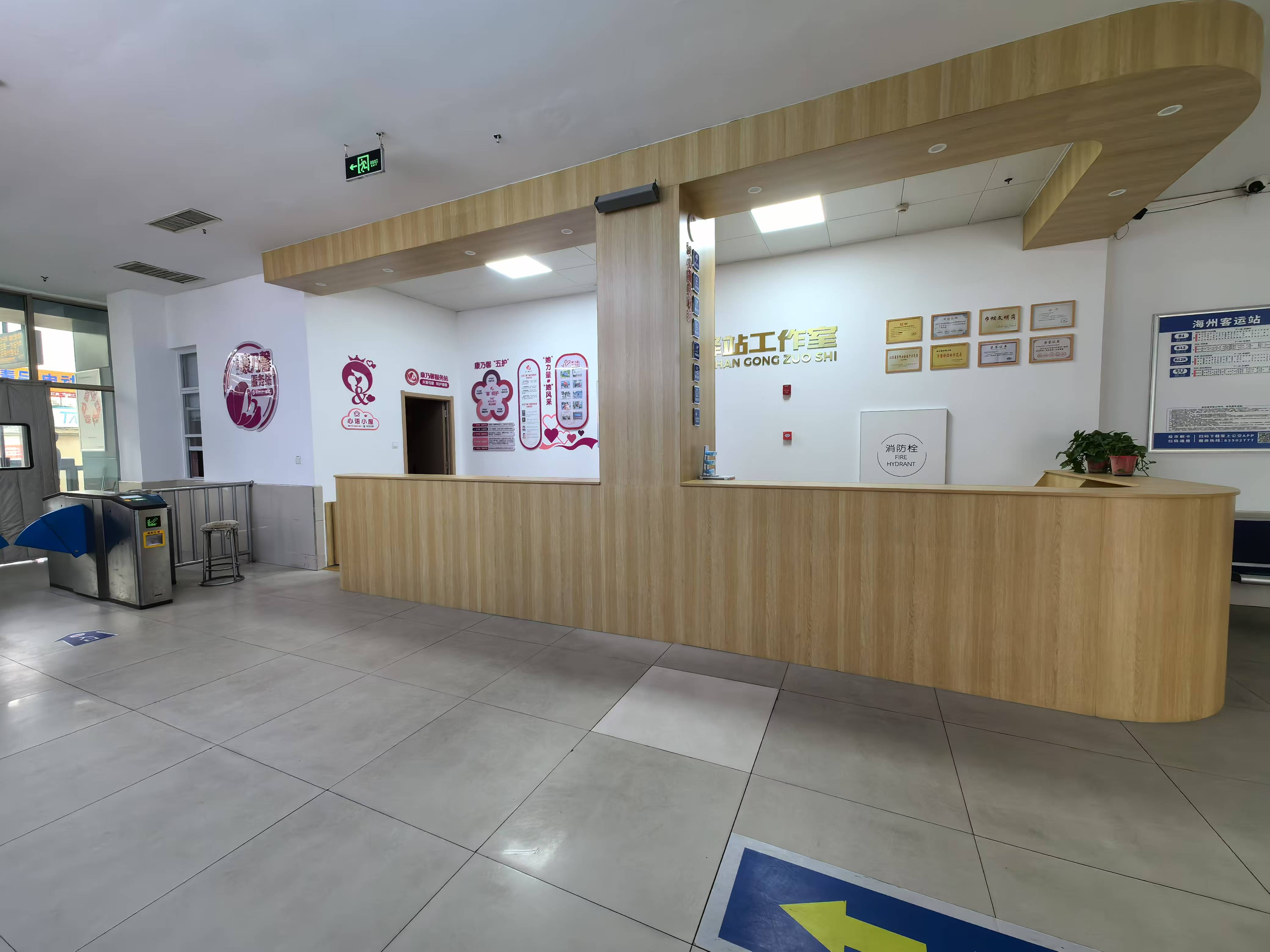 快速公交事业部共有女职工134名,其中站务员占84名,她们热心服务乘客,为企业赢得信誉。她们敬业爱岗,在重大活动和恶劣天气的运输保障中,发挥着“半边天”的力量。为凝聚女职工,关爱女职工,夯实品牌建设,公交集团以海州客运站为阵地,集“服务、学习、心理疏导、健康普及、法律宣传”等服务功能为一体,进入海州客运站,金色拉丝“BRT馨驿站工作室”赫然醒目,一幅幅荣誉奖牌如同礼兵守护在侧。温馨的原木色吧台将大厅划分为两个部分,东侧主要是面向女职工服务的“康乃馨服务站”,墙面展示着女职工“五护”、专家服务团队介绍、站务员工作风采等内容。为听取女职工的建议与心声,特地设置了“回音壁”一栏。为充分利用有限的空间,立柱背面做了书柜形成读书角,便于女职工随时阅览。