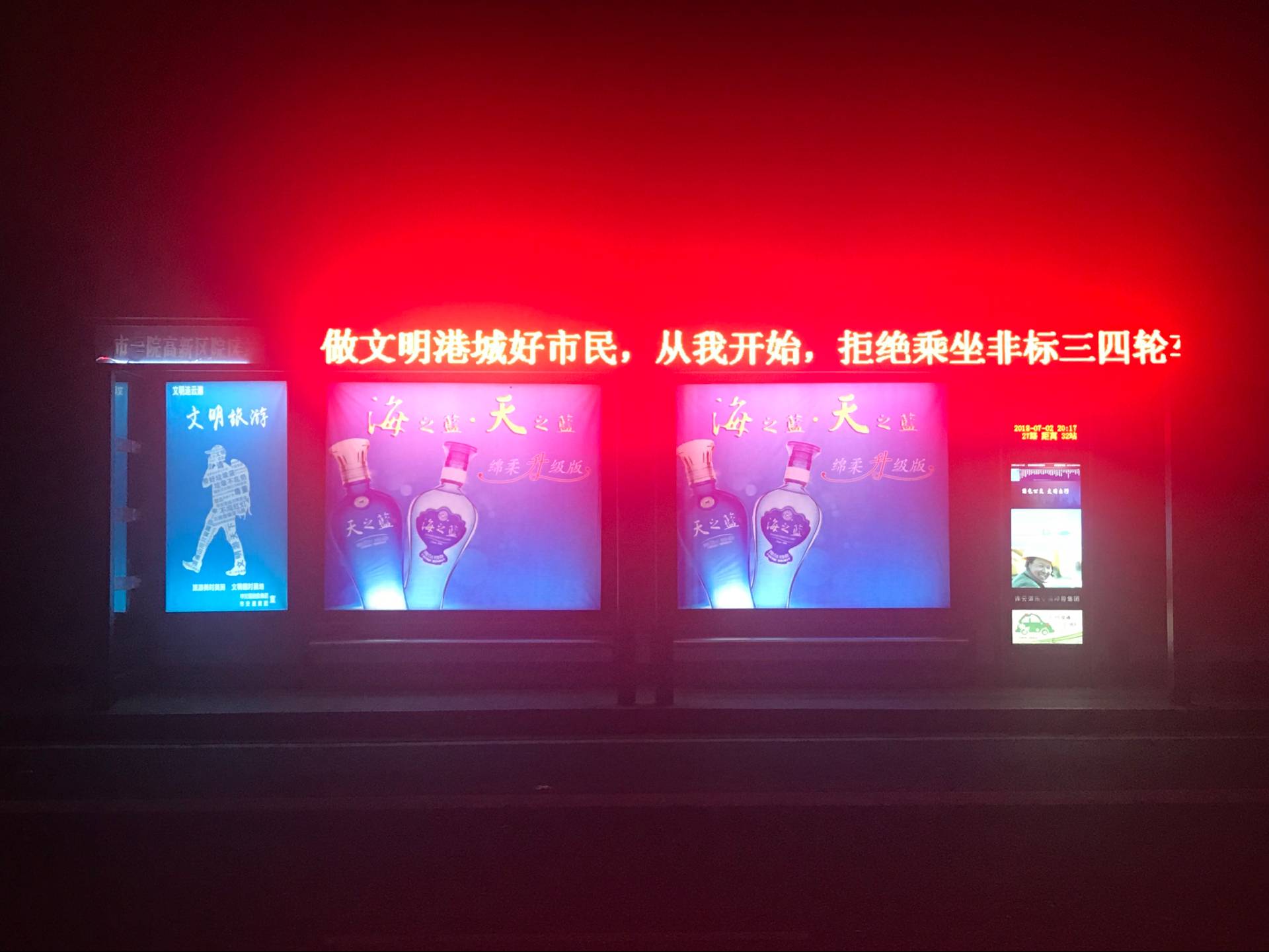 当晚,集团组织职工对市区公交站亭进行排查,将部分旧的宣传语更新为“做文明港城好市民,从我开始,拒绝乘坐非标三四轮车”,以此提醒广大市民乘坐正规可靠的车辆出行,预防和减少道路交通事故,保障人民群众出行安全。同时,提高市民对创文工作的知晓率和参与率,为集团创文工作营造良好氛围。