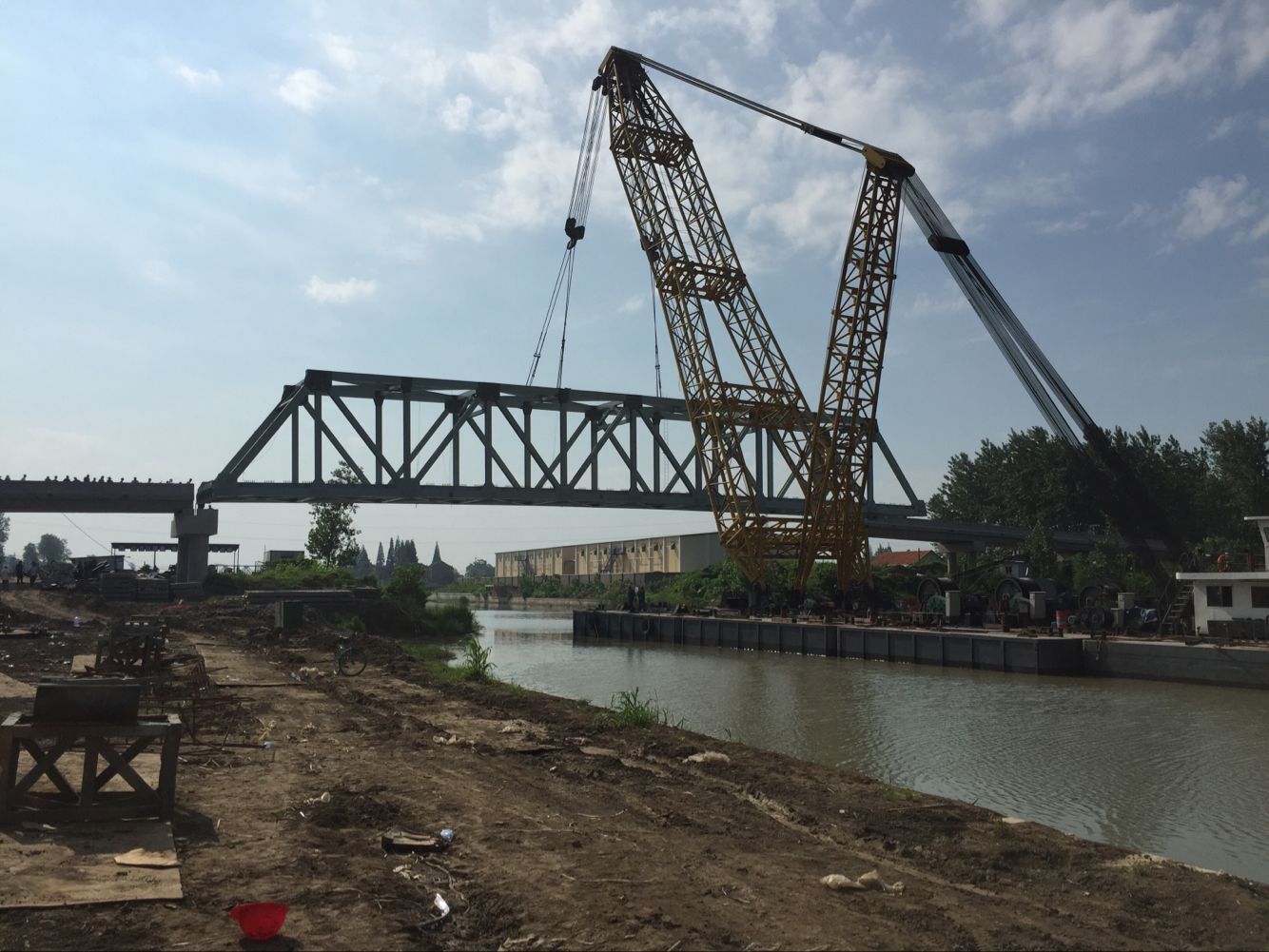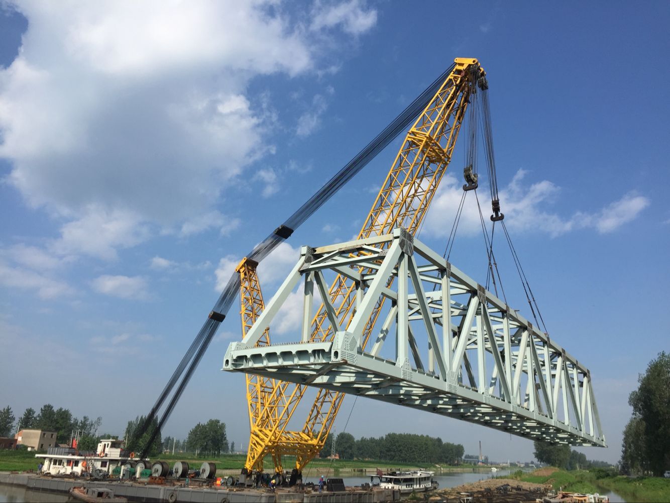 近日,由江苏海通公司承建的阜宁县农村公路危桥改造项目兴隆大桥255T钢桁梁吊装工作全部完成。该项目采用65米单跨简支钢桁梁,主桁采用带竖杆的华伦式三角形腹杆体系,节间长度6.5米,主桁高度8.5米,高跨比为1/7.65,两片主桁主心距7.05米,宽跨比为1/9.22,桥面宽度6.0米。吊装采用600T浮吊,通过定位、落梁、调整等步骤成功完成吊装。
