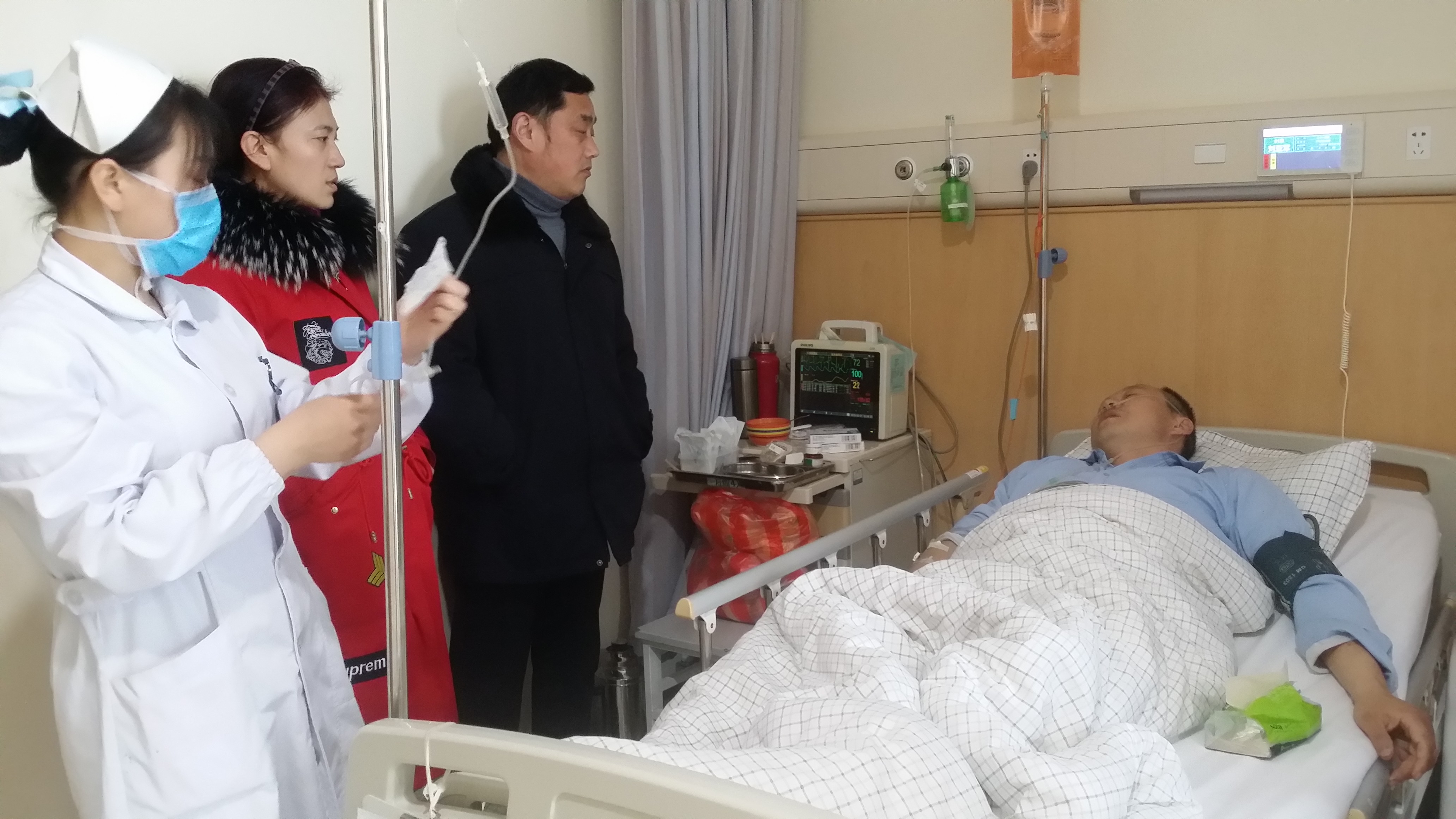 2019年3月1日下午,快客公司工会主席吴加英、副经理姜永中及相关人员来到市人民医院探望慰问因肺部出血住院治疗的职工刘亚军同志,把慰问品和慰问金送到他手中,为他送去工会的关怀和温暖。