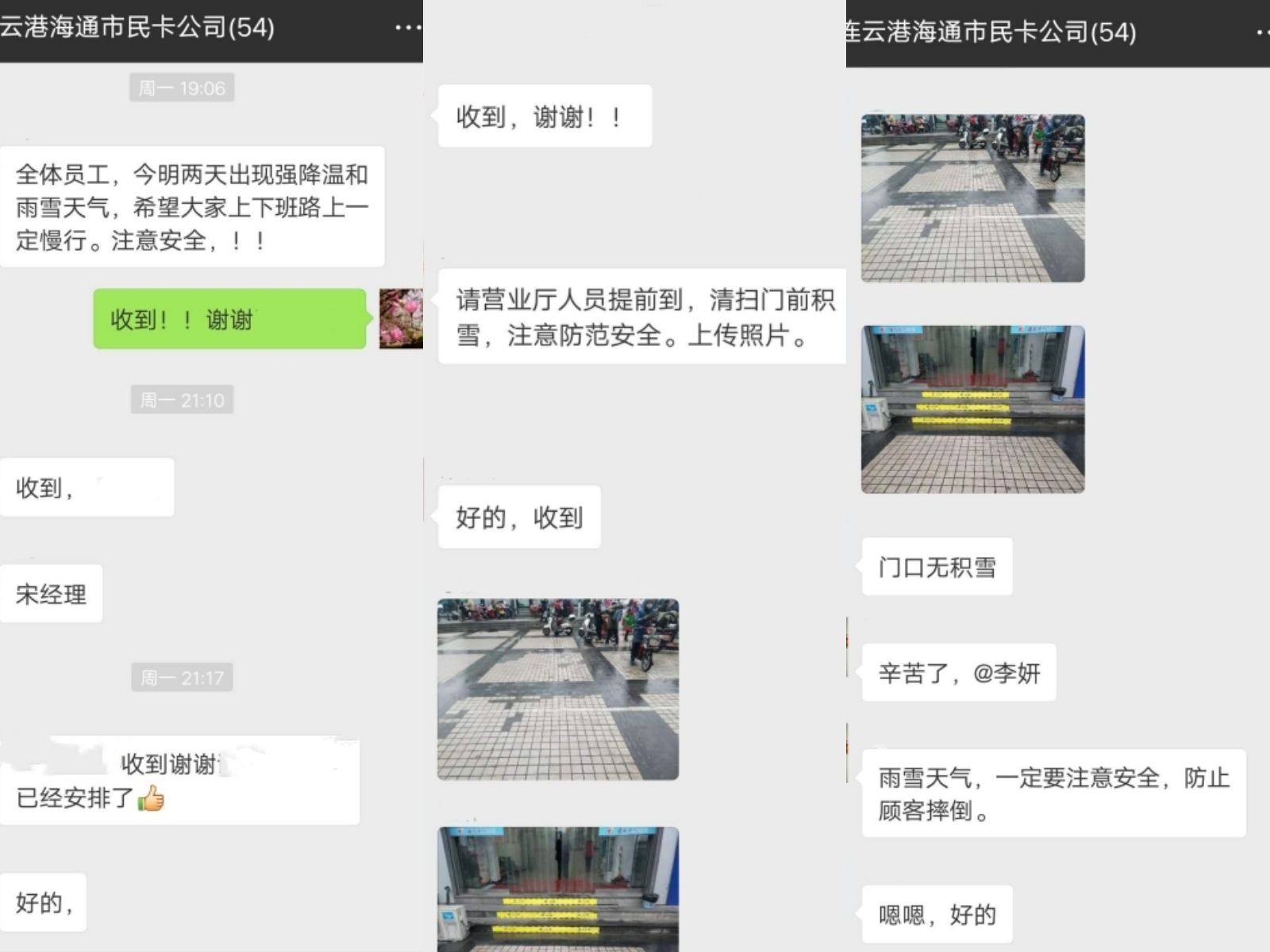 一场罕见的大雪激发了公司青年们热血沸腾的心,12月11日清晨,市民卡公司新浦、连云客服中心的同事早早的提前来到工作岗位,全力以赴投入到扫雪铲冰的工作中去,第一时间清理外厅营业场所及道路上的雪与冰,并在营业厅在门前张贴“台阶湿滑,小心滑倒”告示,厅内摆放防滑垫。
