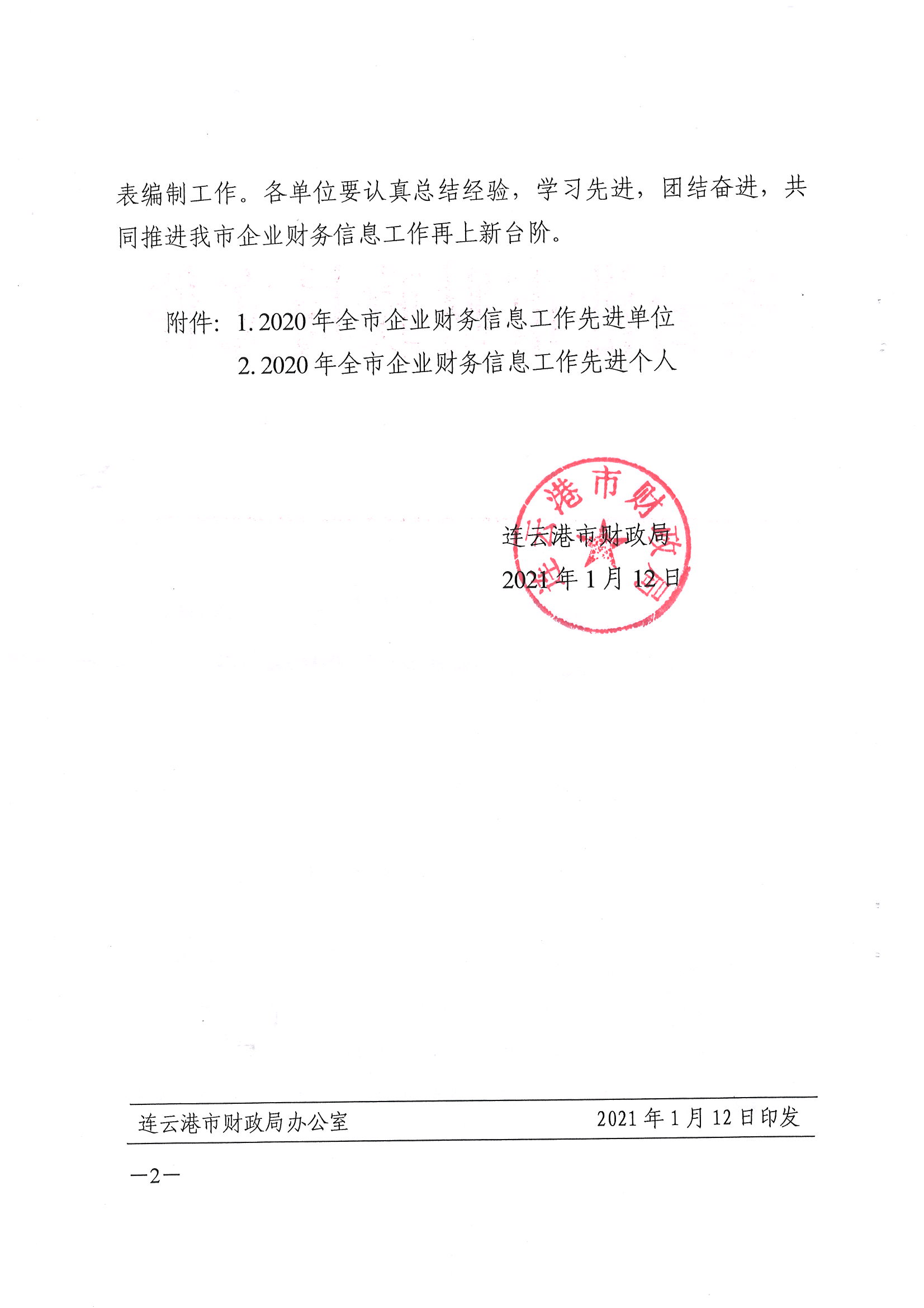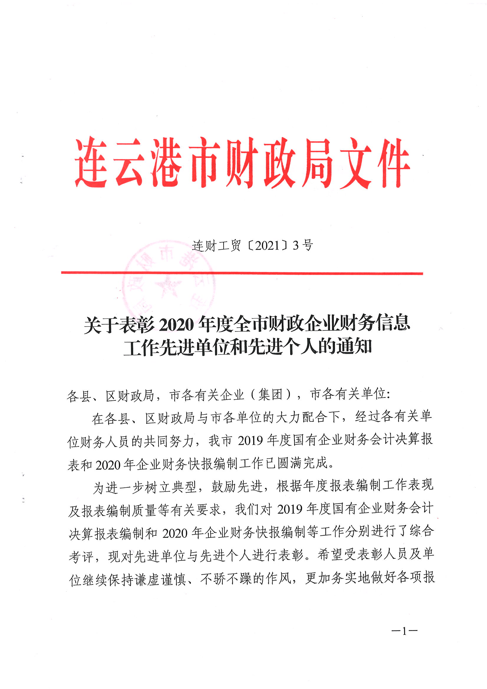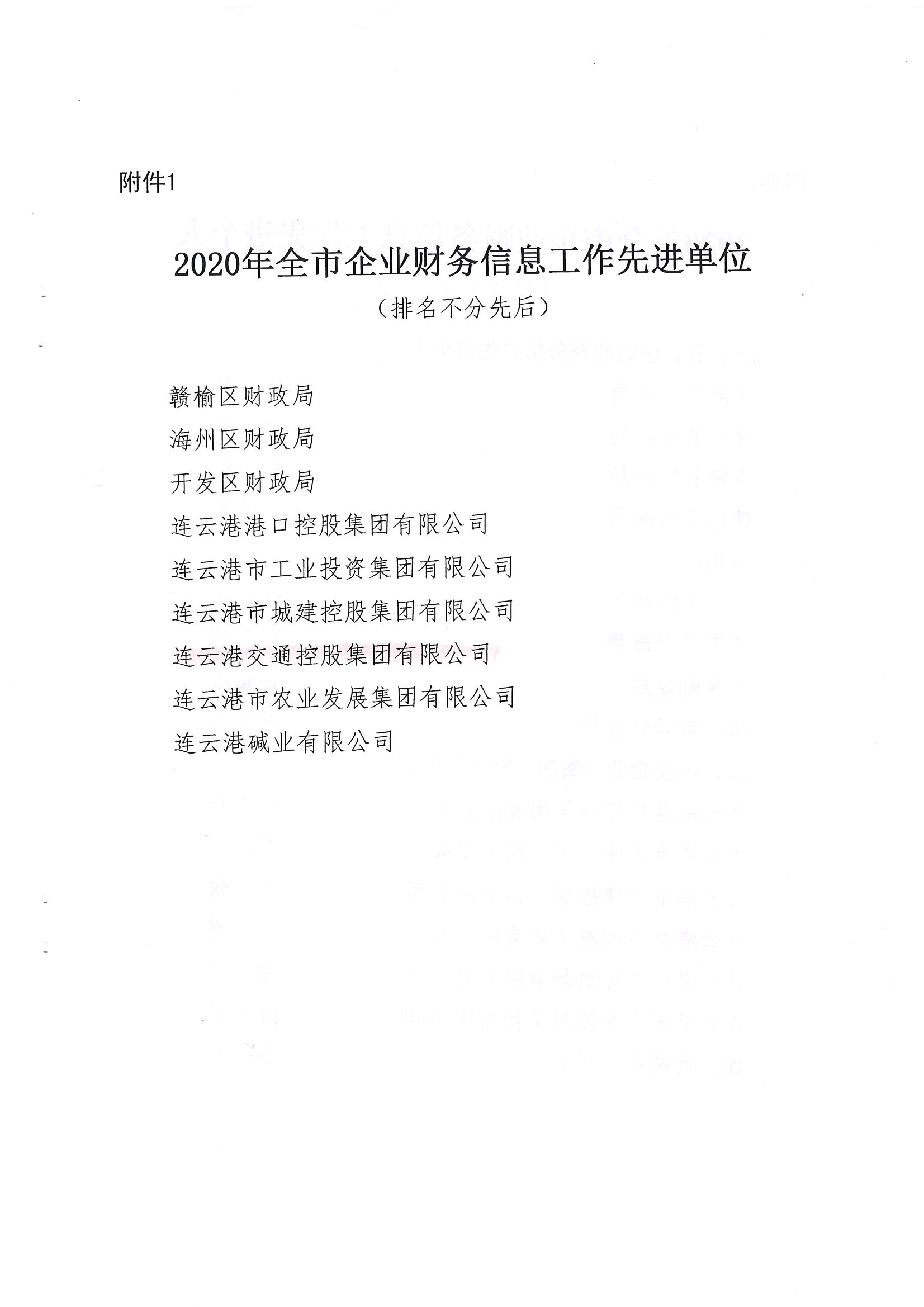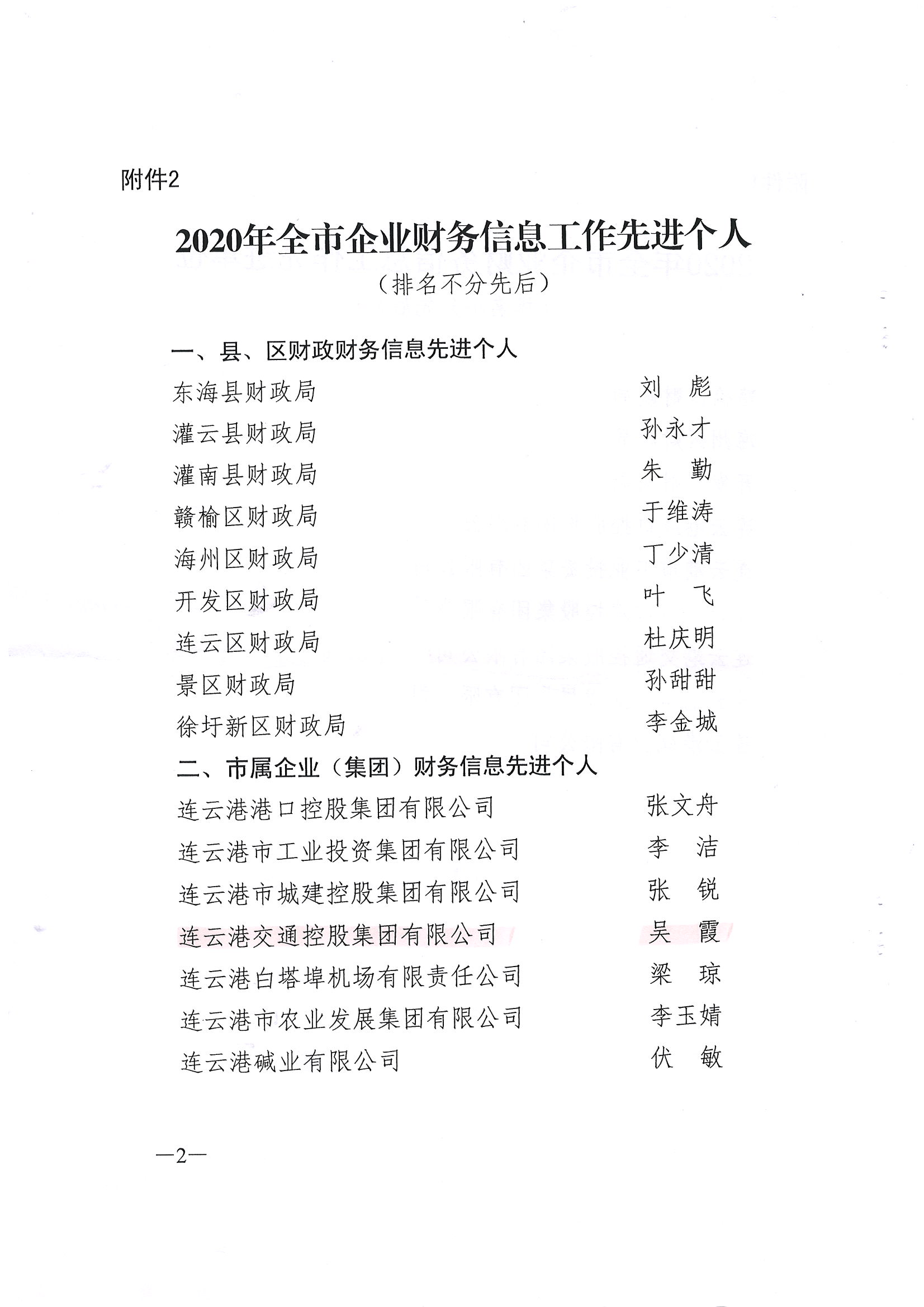 日前,经连云港市财政局下发文件通知,对2020年企业财务快报编制工作综合考评,集团被评为全市财务信息工作先进单位,集团财务融资部吴霞被评为财务信息工作先进个人。