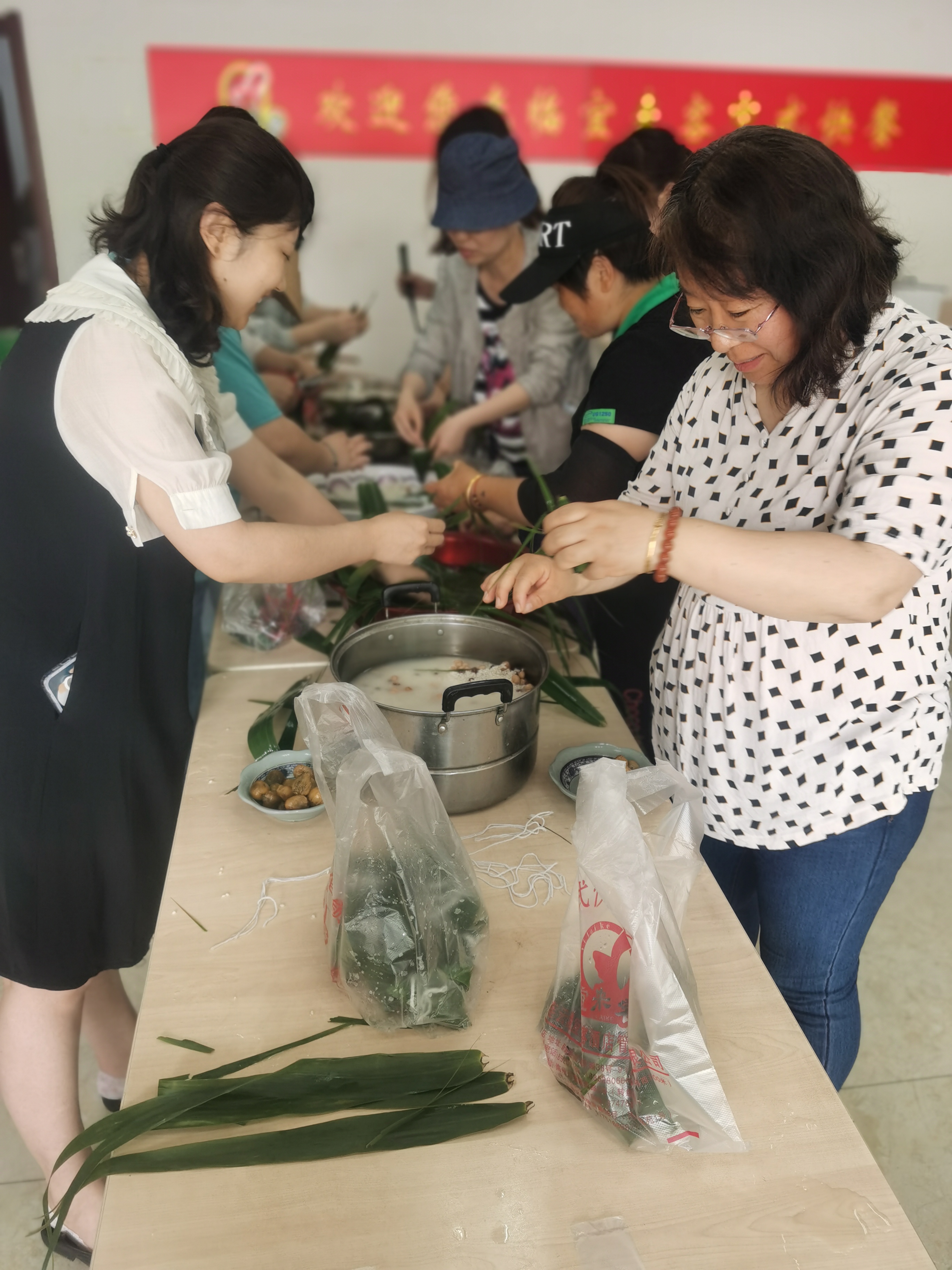 下午2点,包粽子活动正式开始。活动现场,技术娴熟的同事先做包粽子展示,其他同事纷纷讨教包粽子的方法技巧,也跟着包起来。大家齐上阵,齐上手,同参与,边包粽子,边分享工作日常,职工食堂里充满了一片和谐融洽的温馨景象。经过三个小时的努力,一盆盆糯米变成了一个个满怀情谊的粽子。