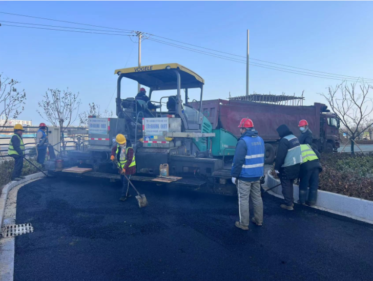 为确保本次沥青面层摊铺工作顺利进行,江苏海建公司通仁分公司加强统筹施工组织,现场工作人员目标同向、合力共为,提前落实材料进场计划,一丝不苟严格把控摊铺作业质量。同时努力克服低温等不利因素,按期完成节点任务。