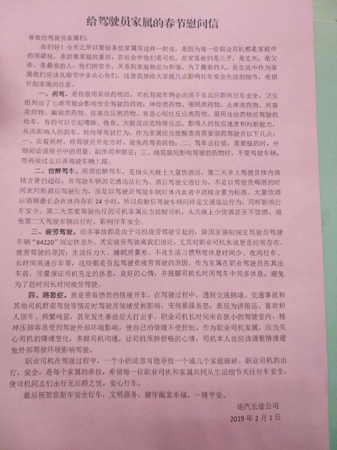 交通客运安全是长途公司安全生产最关键的环节。为保障安全服务,夯实安全基础,2月1日,长途公司将驾驶员安全管理与家庭相结合,开展了“给驾驶员家属的春节慰问信”活动。
