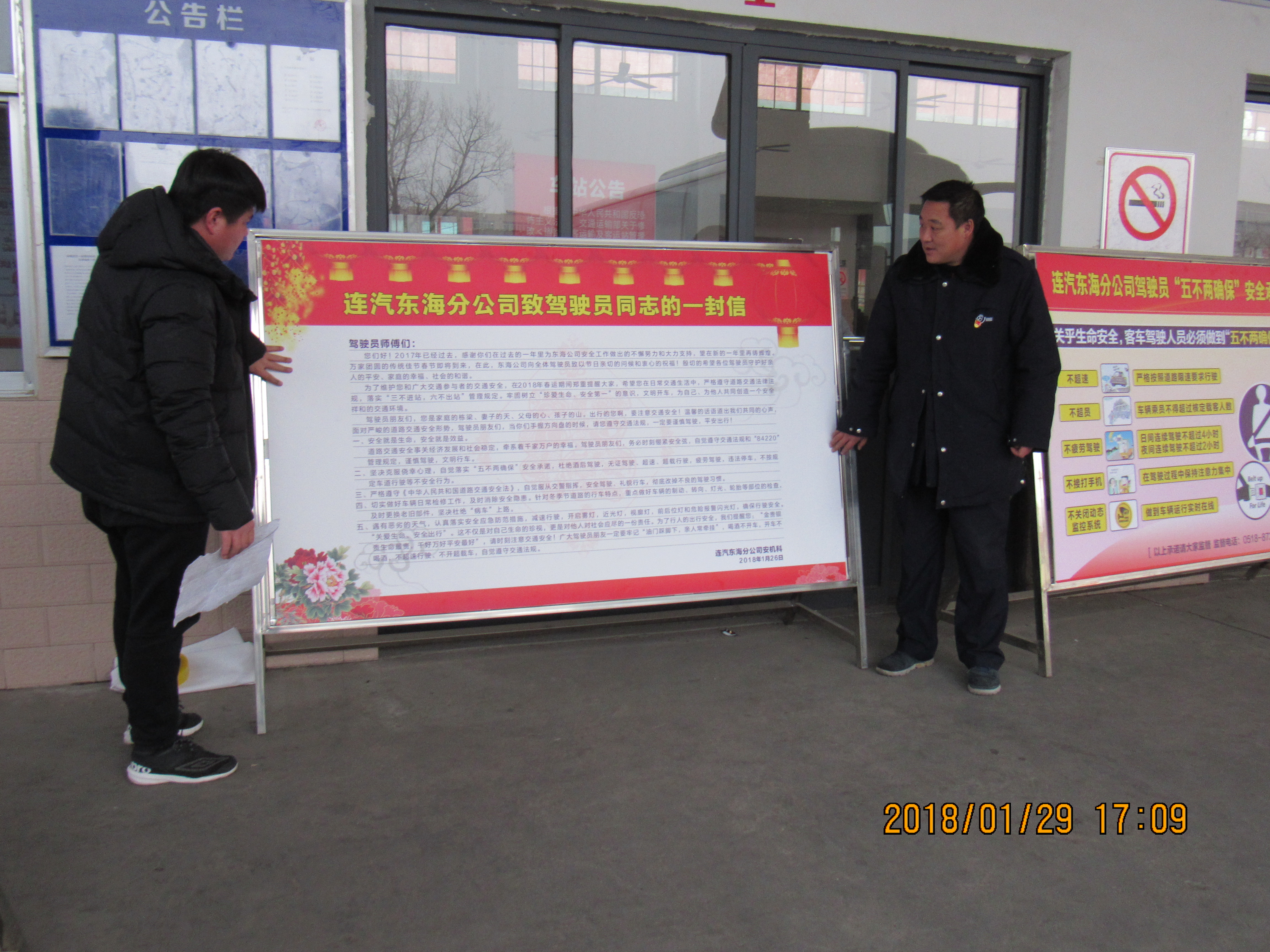 为认真落实企业安全生产主体责任,加强安全生产宣传力度,营造春运安全生产文化氛围,展现安全生产工作新气象,连汽东海分公司及时悬挂横幅和进行更新布设安装安全文化长廊。