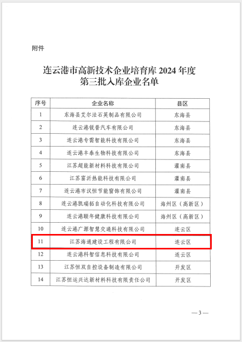 近日,从连云港市科技局获悉,海建公司成为连云港市高新技术企业培育库2024年度第三批入库企业。