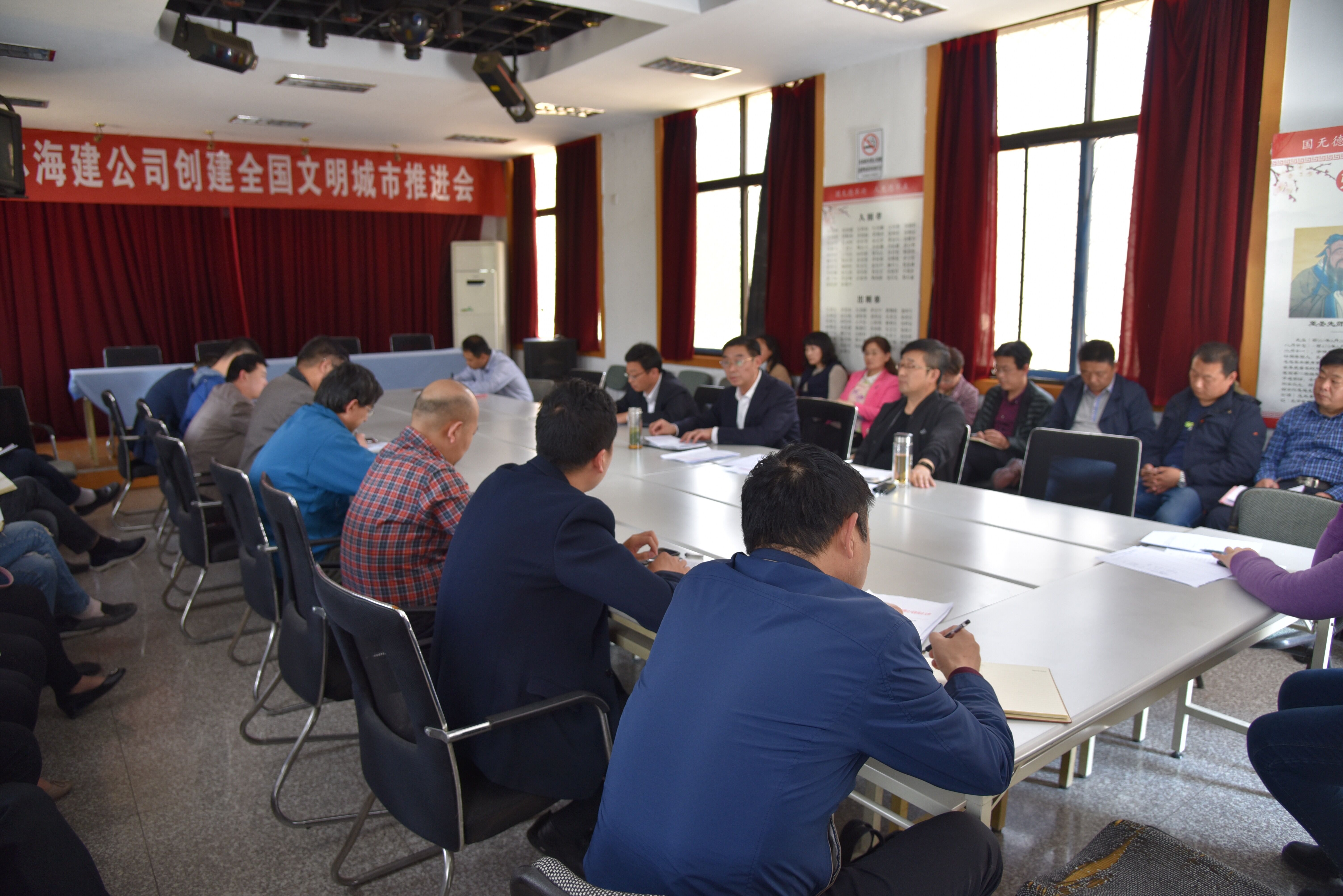 5月8日,江苏海建公司在多功能厅召开创建全国文明城市推进会,公司相关领导及各分(子)公司、各部门负责人参加会议。