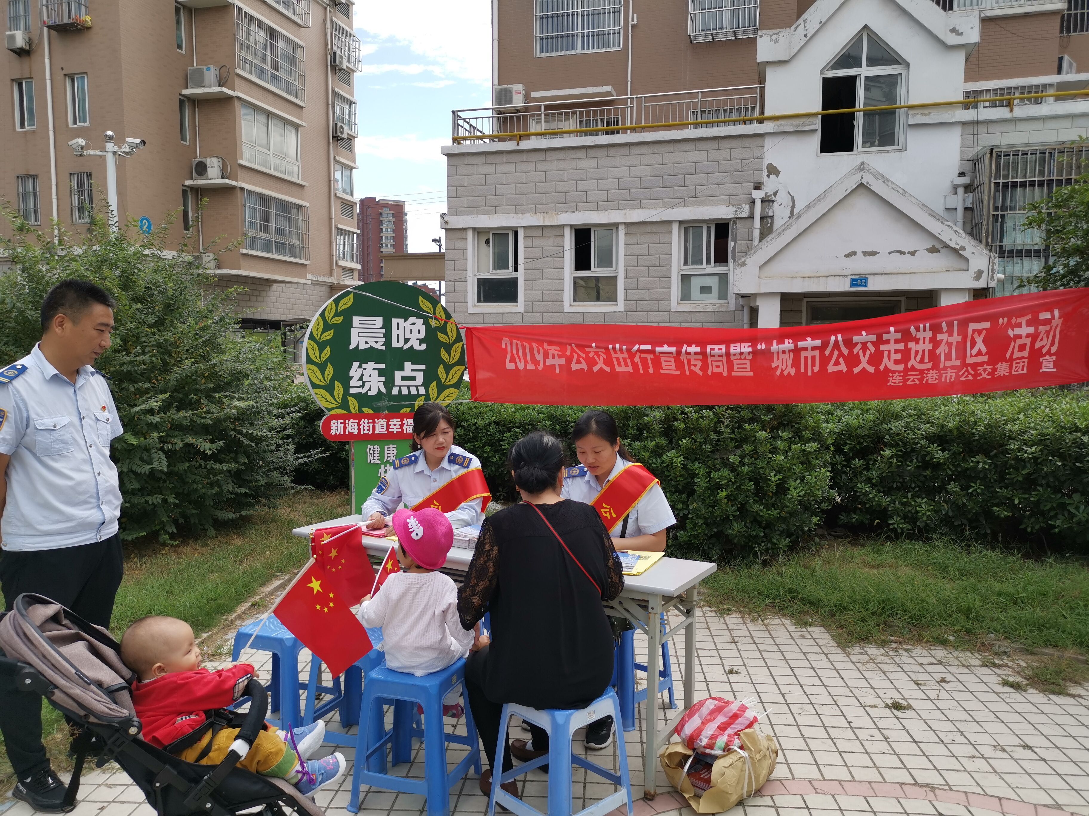 9月19日上午,公交集团开展2019年公交出行宣传周暨“城市公交走进社区”活动,本次活动地点设在新海街道幸福社区,现场摆放桌椅,悬挂横幅,公交集团4名志愿者身披绶带,向社区居民发放公交出行宣传周倡议书和手持小国旗,以现场咨询服务、发放调查问卷形式,邀请社区居民积极参与到活动中来。