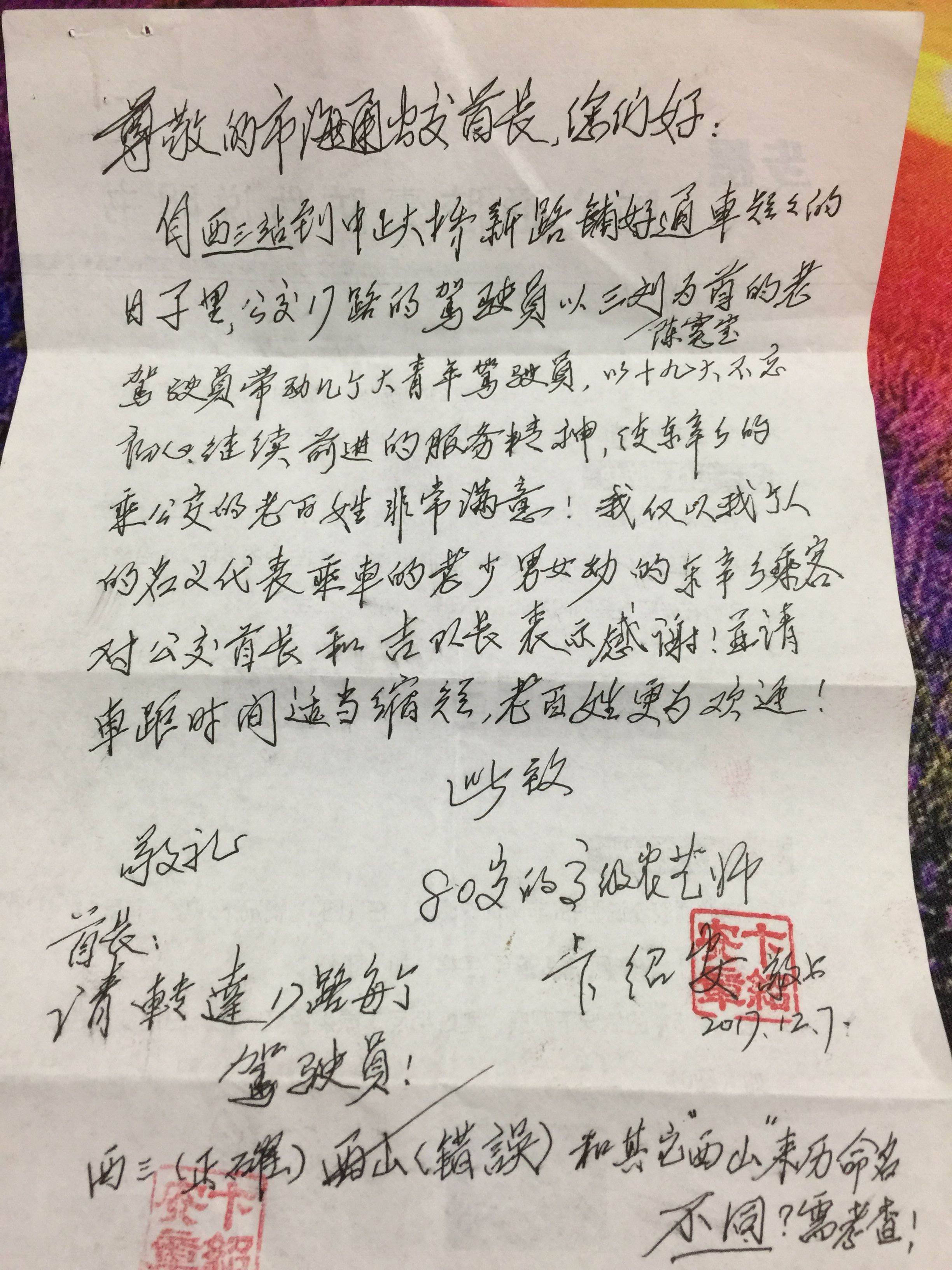 12月11日,公交集团新浦公司收到一封乘客来信,写信人是一位80岁的高级农艺师,名叫卞绍安。他在信中写道“17路在驾驶员陈宽宝师傅的带领下,全线驾驶员服务热情周到,视乘客为家人,坚持以十九大“不忘初心,继续前进”的服务精神严格要求自己,做好服务工作。”