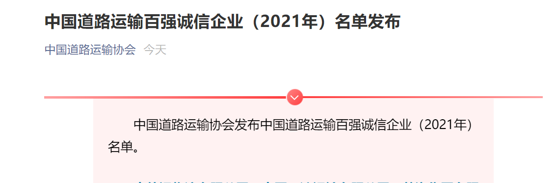 据了解,中国道路运输协会是中国道路运输行业唯一的全国性5A 级行业协会。该协会开展“中国道路运输百强诚信企业创建”活动十几年来,借鉴国际通行方法,结合行业实际,每年度对全国范围内道路运输企业规模实力、竞争能力、影响力及诚信经营活动进行科学评价。此次发布的“中国道路运输百强诚信企业(2021)”名单,是目前道路运输行业最具影响力和公信力的榜单之一。