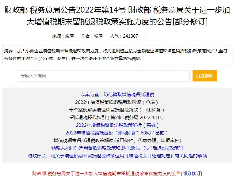 今年上半年国家财政部、税务总局联合发布公告:“加大小微企业增值税期末留抵退税政策力度、将先进制造业全额退还增值税增量留抵税额政策范围扩大至符合条件的小微企业,并一次性退还小微企业存量留抵税额”。