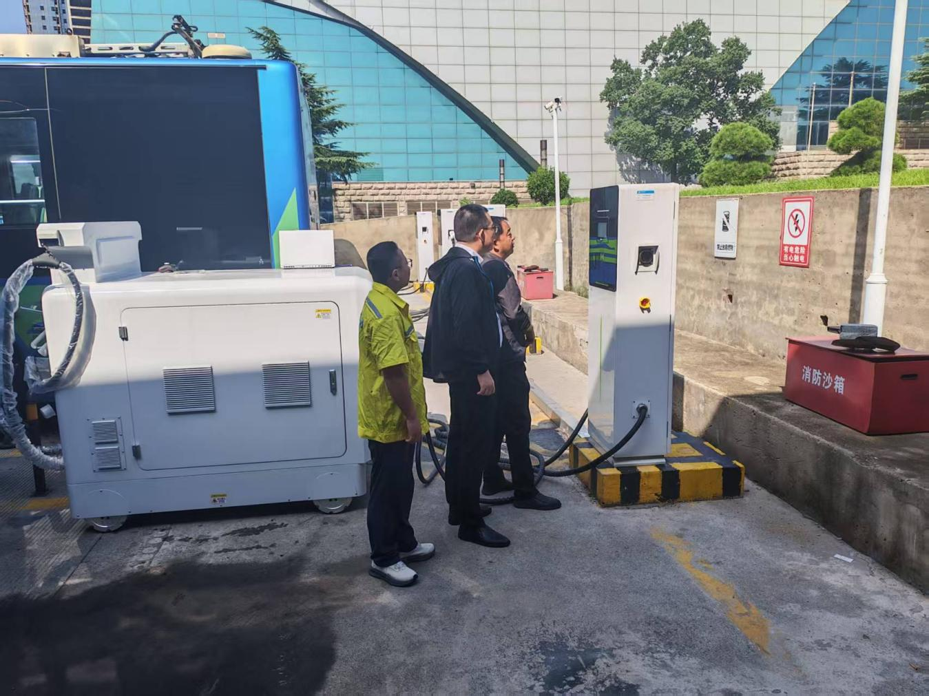 在国展中心站,王平重点查看了超充模块转换器的调试及运行状况,与海宏公司工程师进行深入交流,详细了解该设备的技术特点、运行模式及充电效率等方面的内容,确保设备处于良好运行状态。