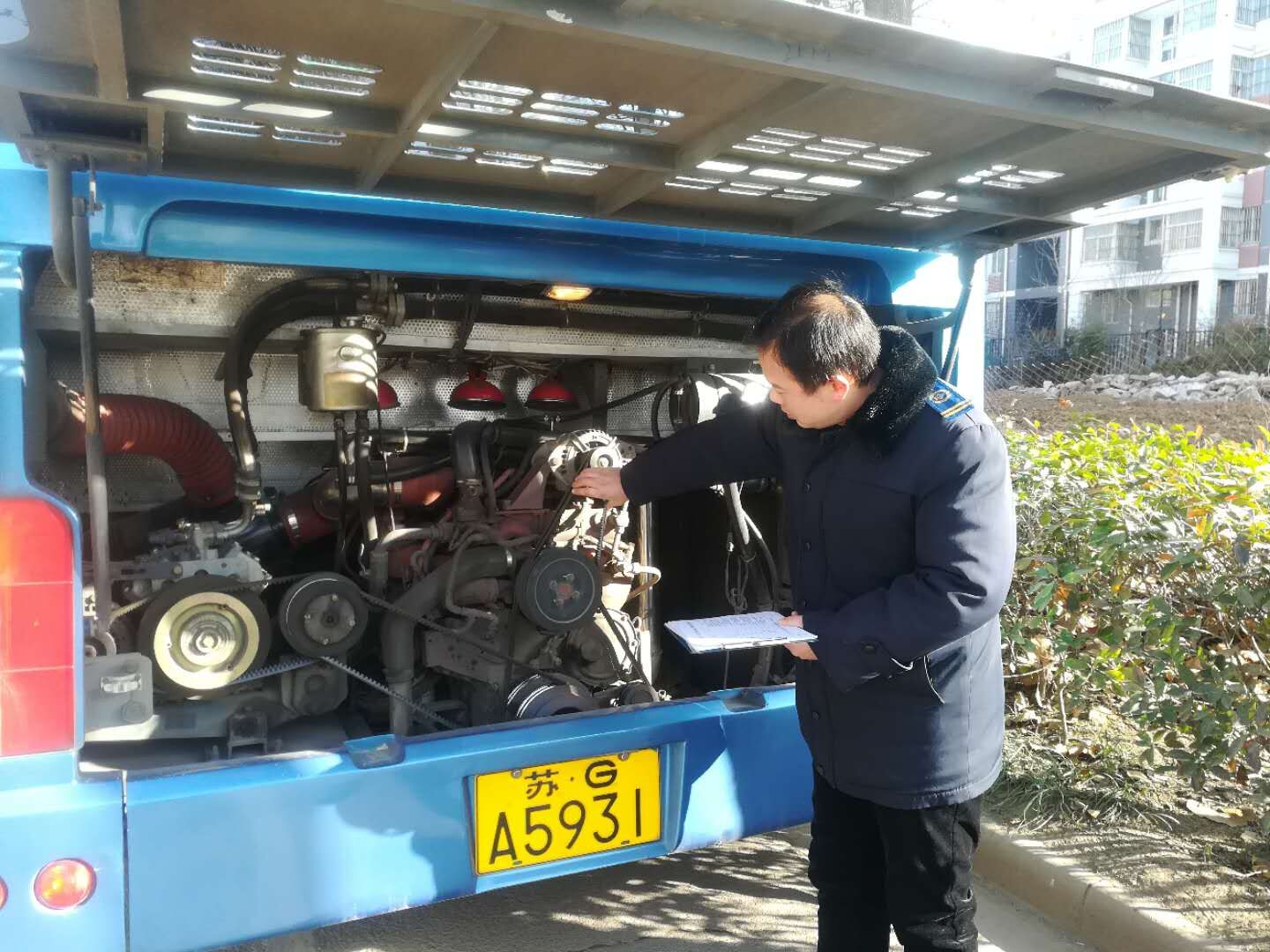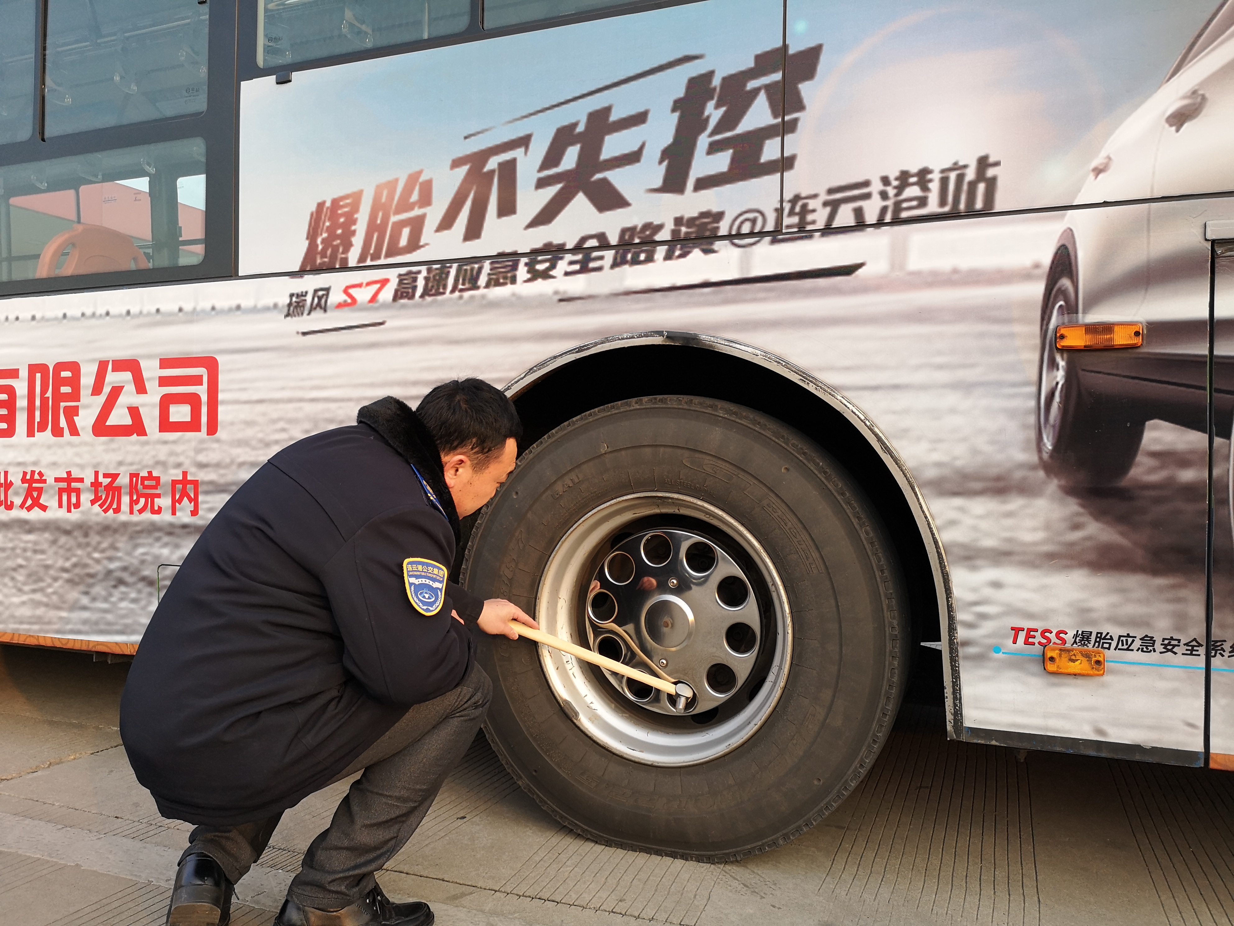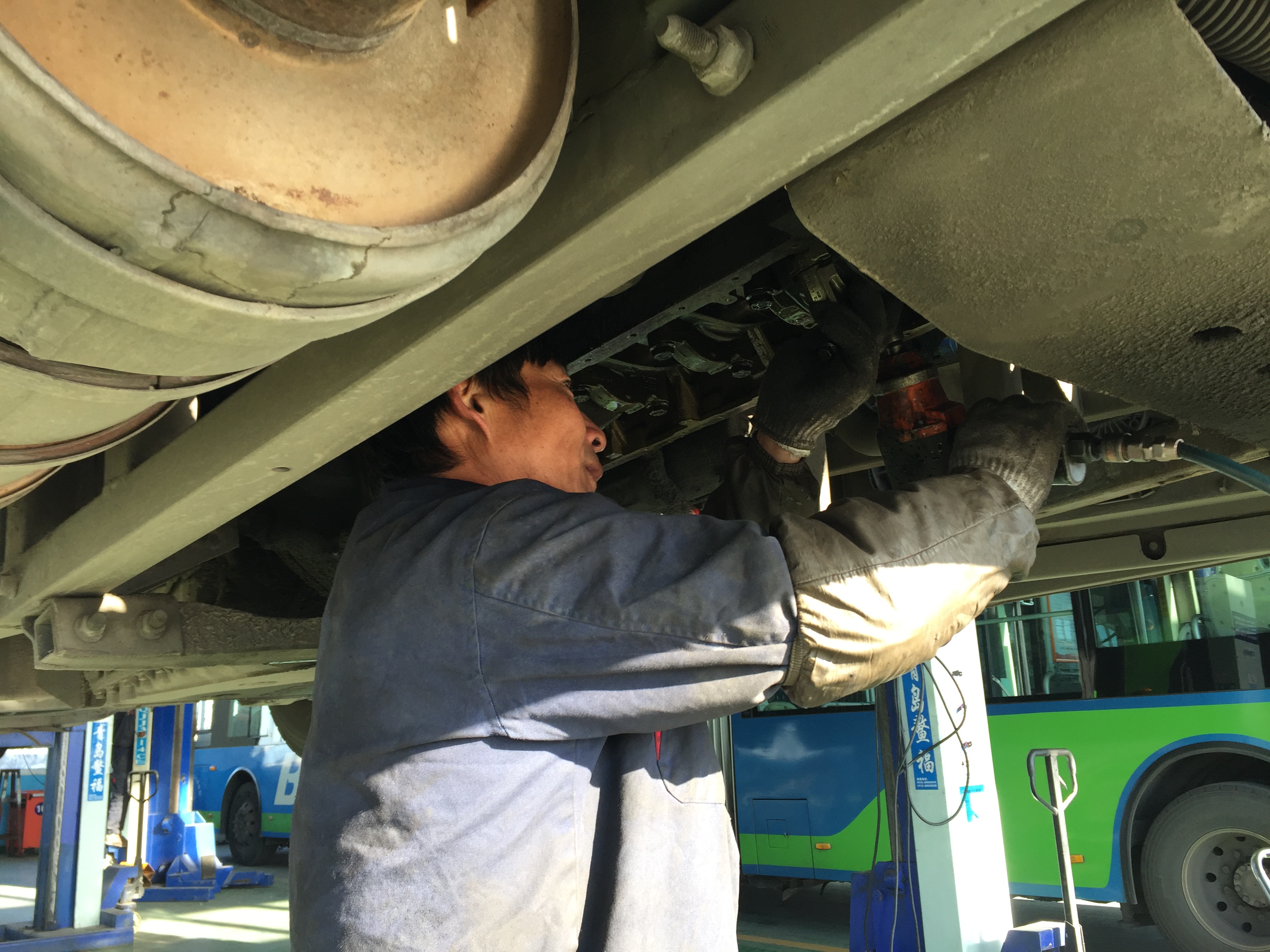 新一年第一天,安机人员认真维护公交车辆,见缝插针检查车辆的每个细节