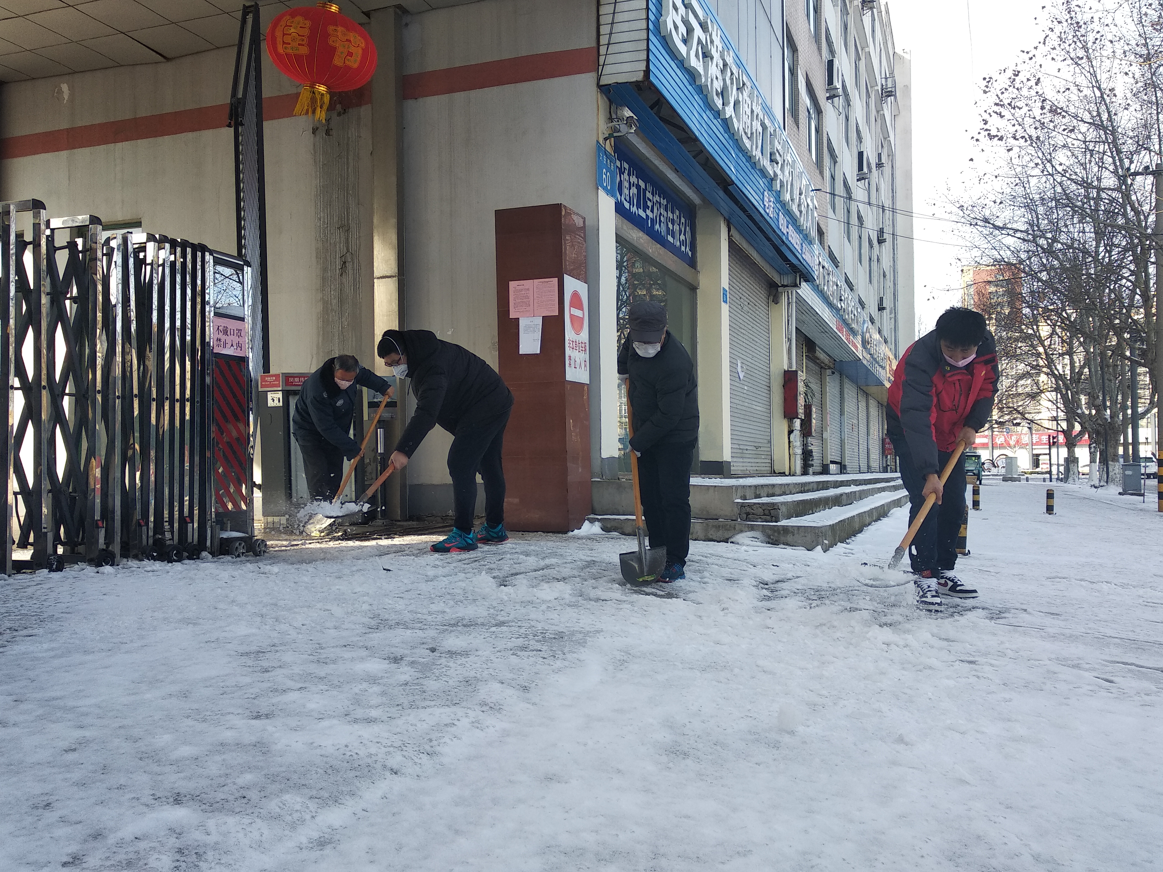 2月16日上午,因前一日连云港市降雪,交培公司组织党员10余人,对公司大庆西路、建设东路办公区域的积雪进行清扫。大家顶着寒风,拿起铁锹、扫把等工具,经过1个多小时的努力,办公区域及大门口积雪基本清理完毕,确保公司出入口及办公区域行走安全。